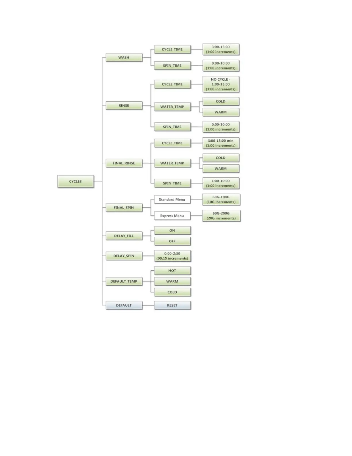 To reset all values in the Cycles option to factory default, press “Enter” when the “DEFAULT”