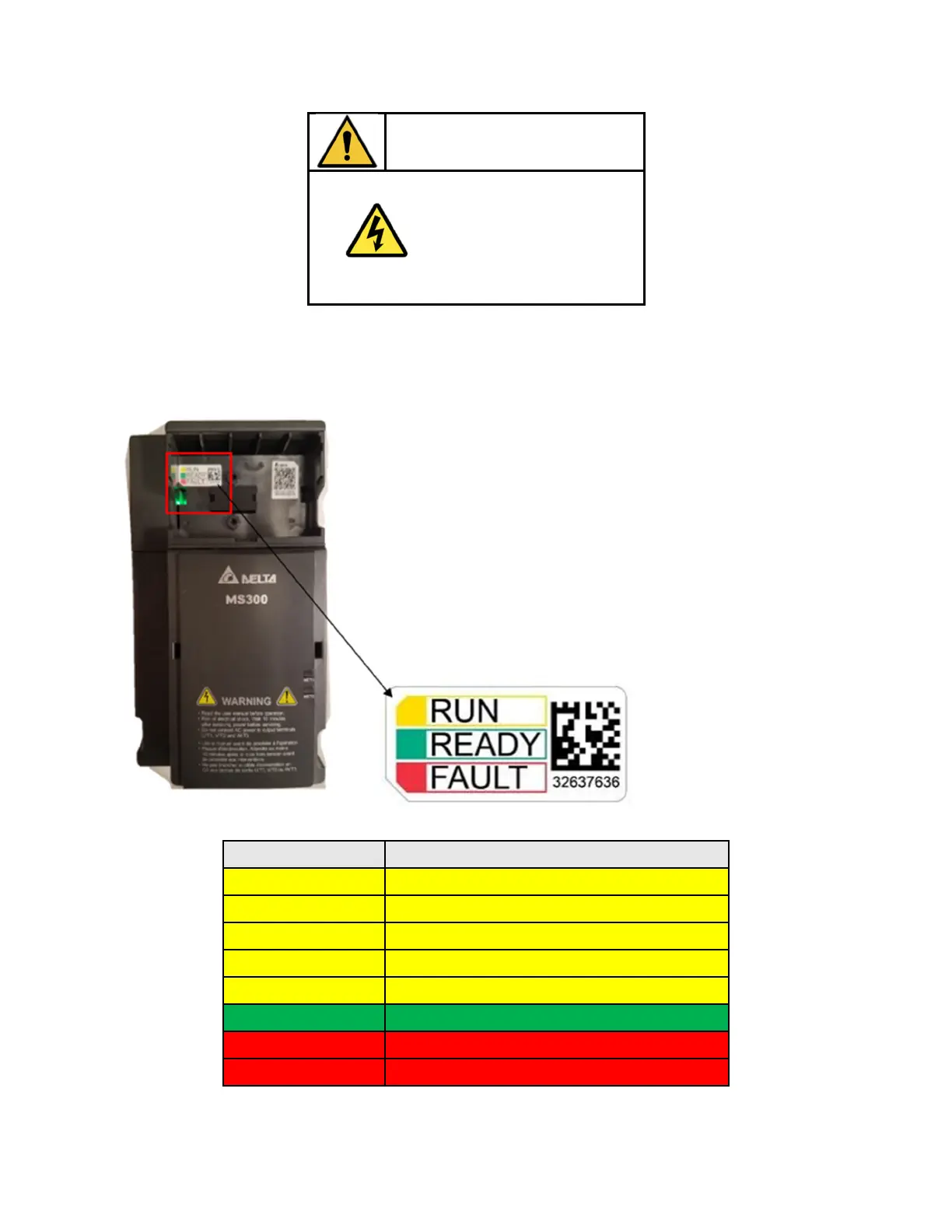 (VFD). They are labeled as “READY”, “RUN”, and “FAULT” and can be used for troubleshooting.
