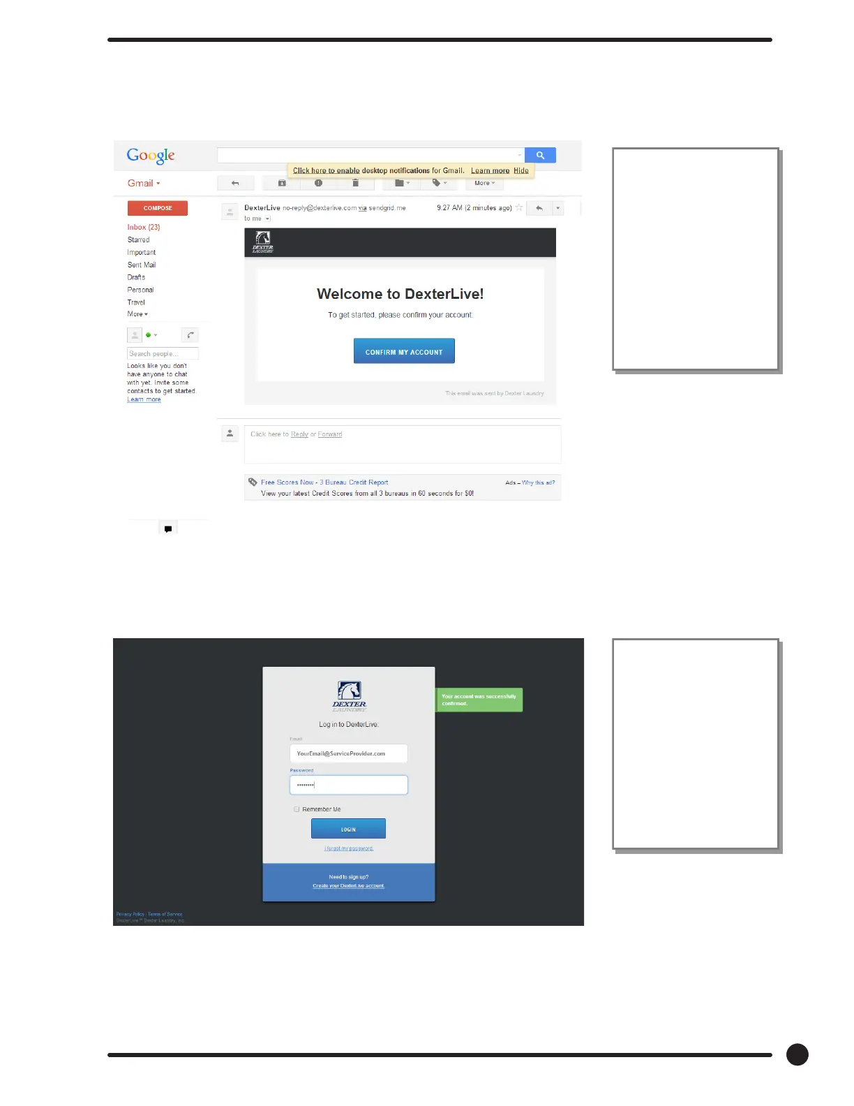 4) At the “Log into DexterLive” screen, enter your e-mail/user name and password to access