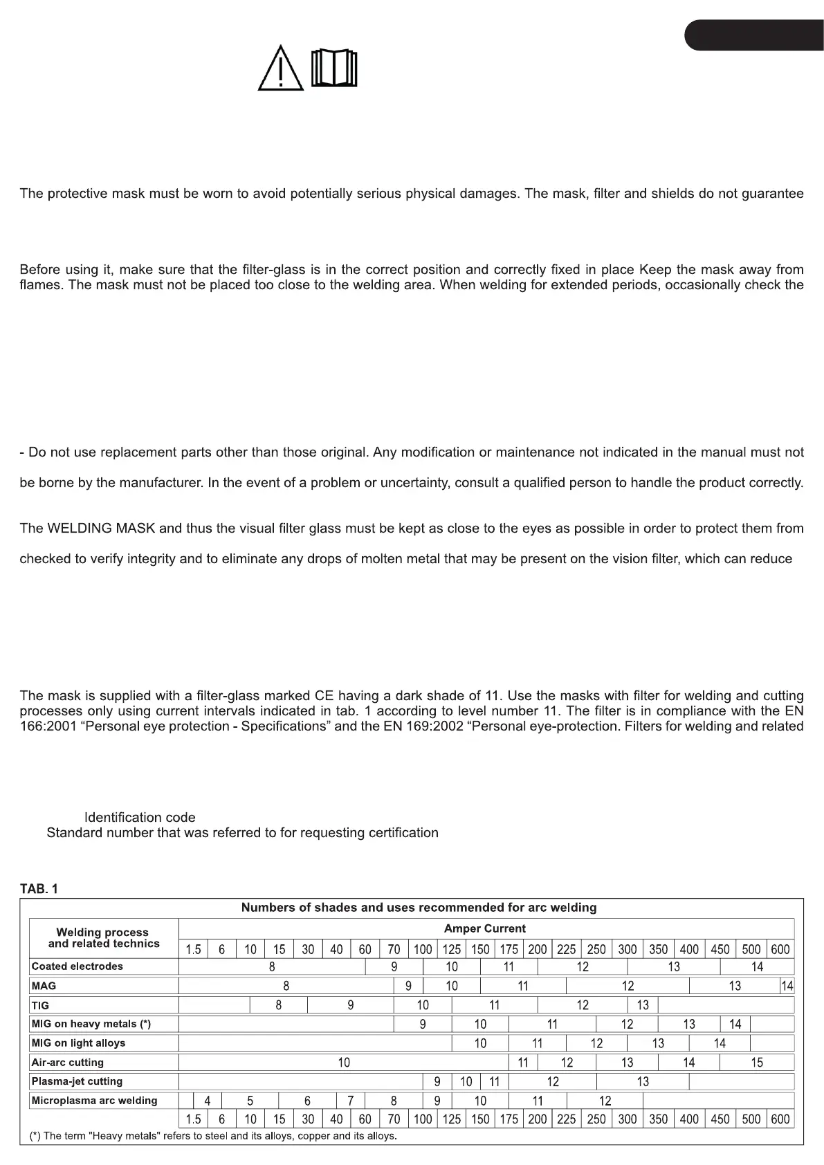 luminous radiations as well as from molten metal drops. After using the mask and before putting it away after working, it must be