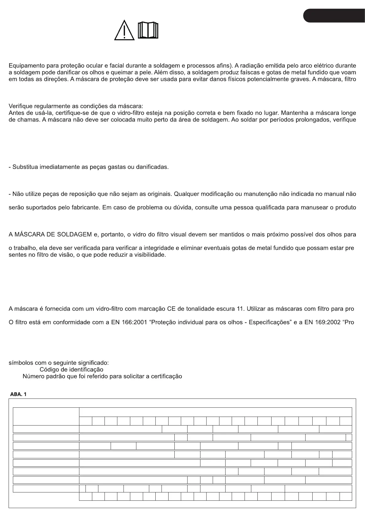 Este modelo de máscara de mão está em conformidade com os requisitos da Norma Europeia EN 175 (Proteção individual.
