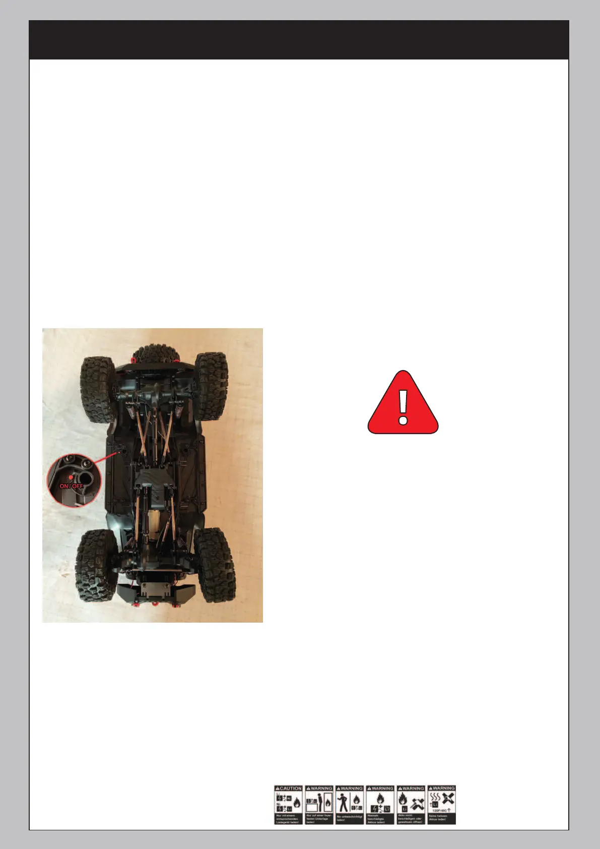 Připojte baterii k řídicí jednotce. Zapněte dálkový ovladač a poté regulátor rychlosti/model. Vypínač modelu najdete na spodní straně