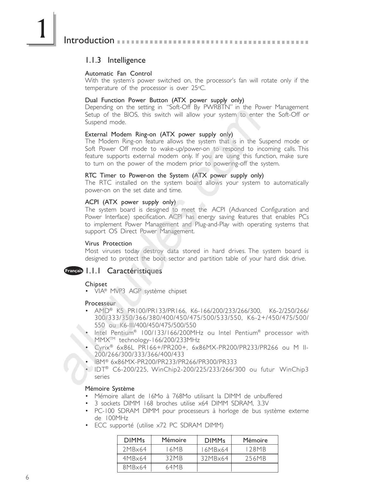 3 sockets DIMM 168 broches utilise x64 DIMM SDRAM, 3.3V