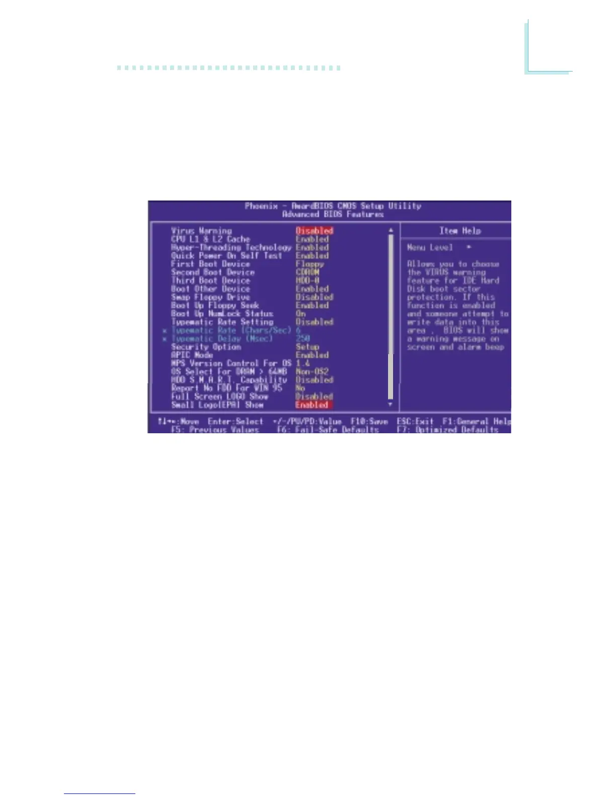 The screen above list all the fields available in the Advanced BIOS Features