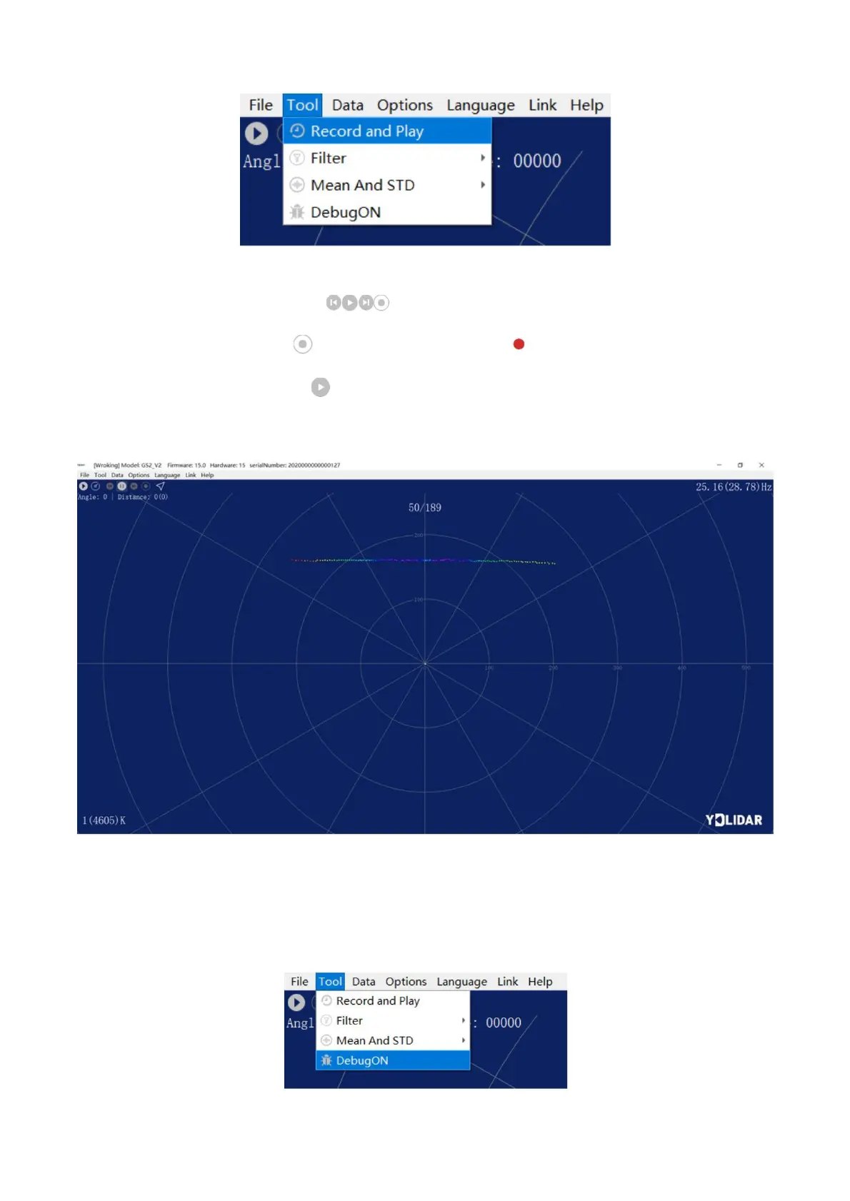 Click [Tools] in the main menu, and then select [DebugON] to output the raw lidar data to the