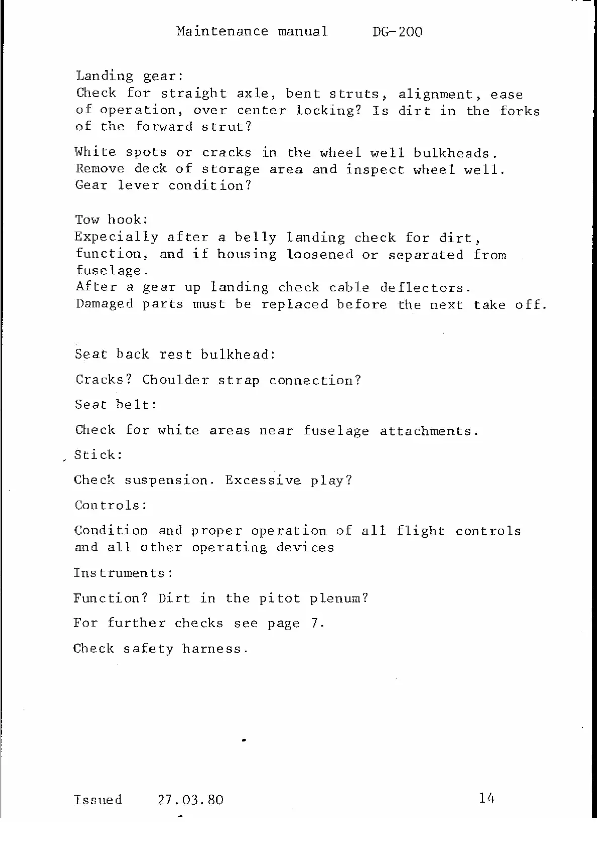 DG Flugzeugbau DG200 - Landing gear:; Tow hook:; Seat back rest bulkhead:; Seat belt:
