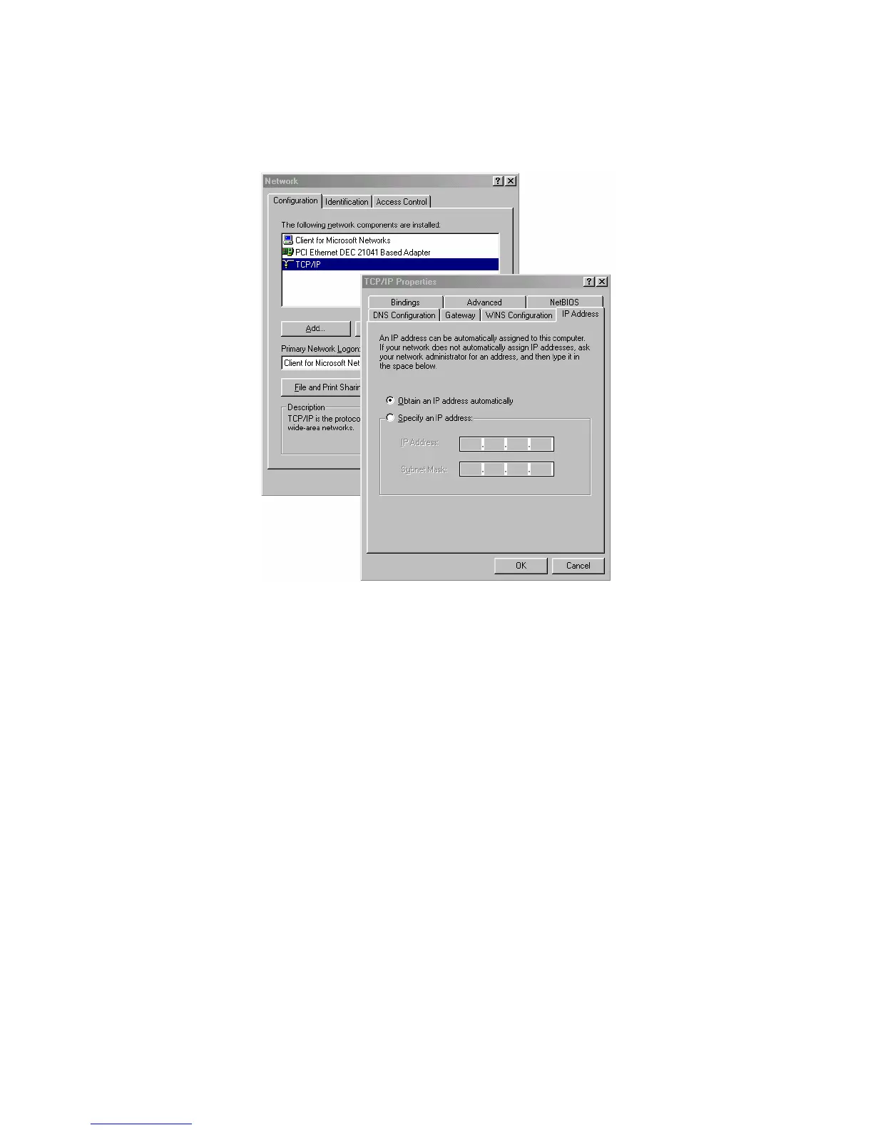 displays a “…TCP/IP Properties” dialog (foreground).