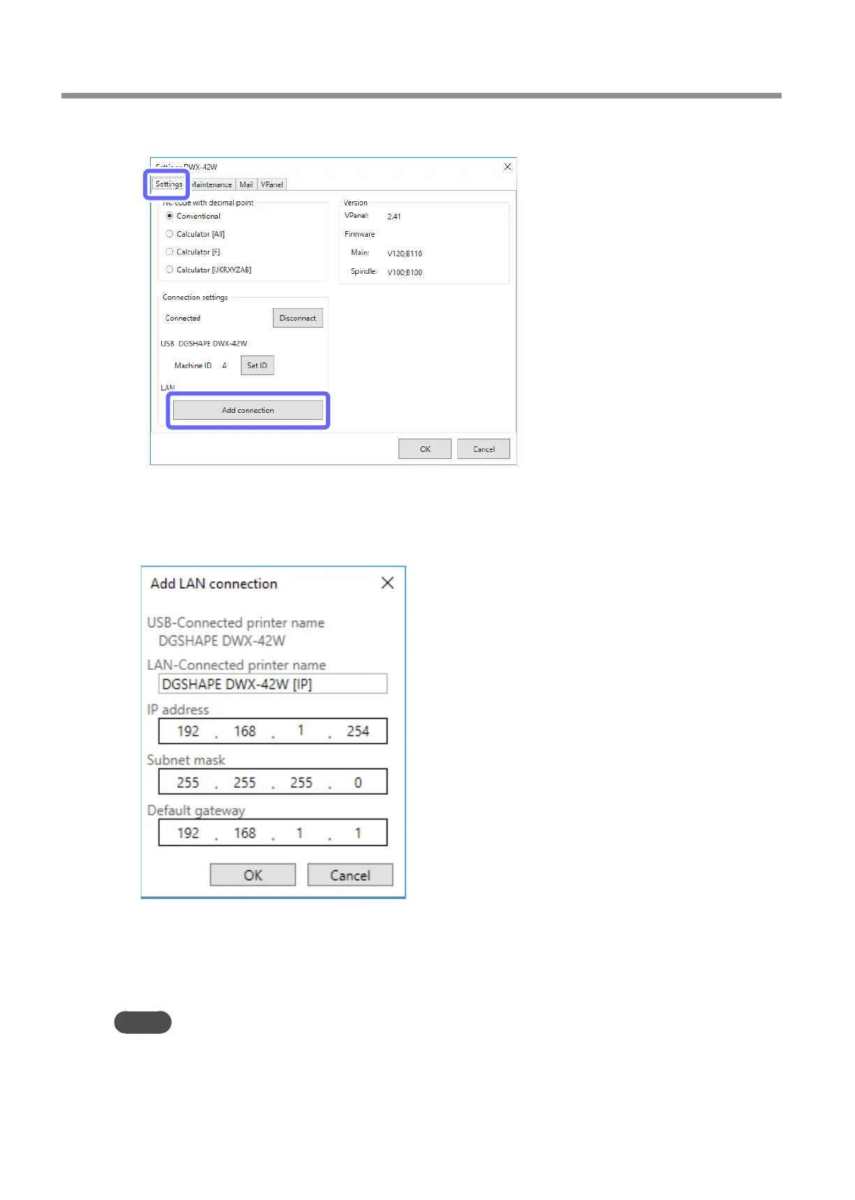 • If you want to change the network settings of the milling machine, click [IP Settings] on the [Settings] tab in the [Settings]