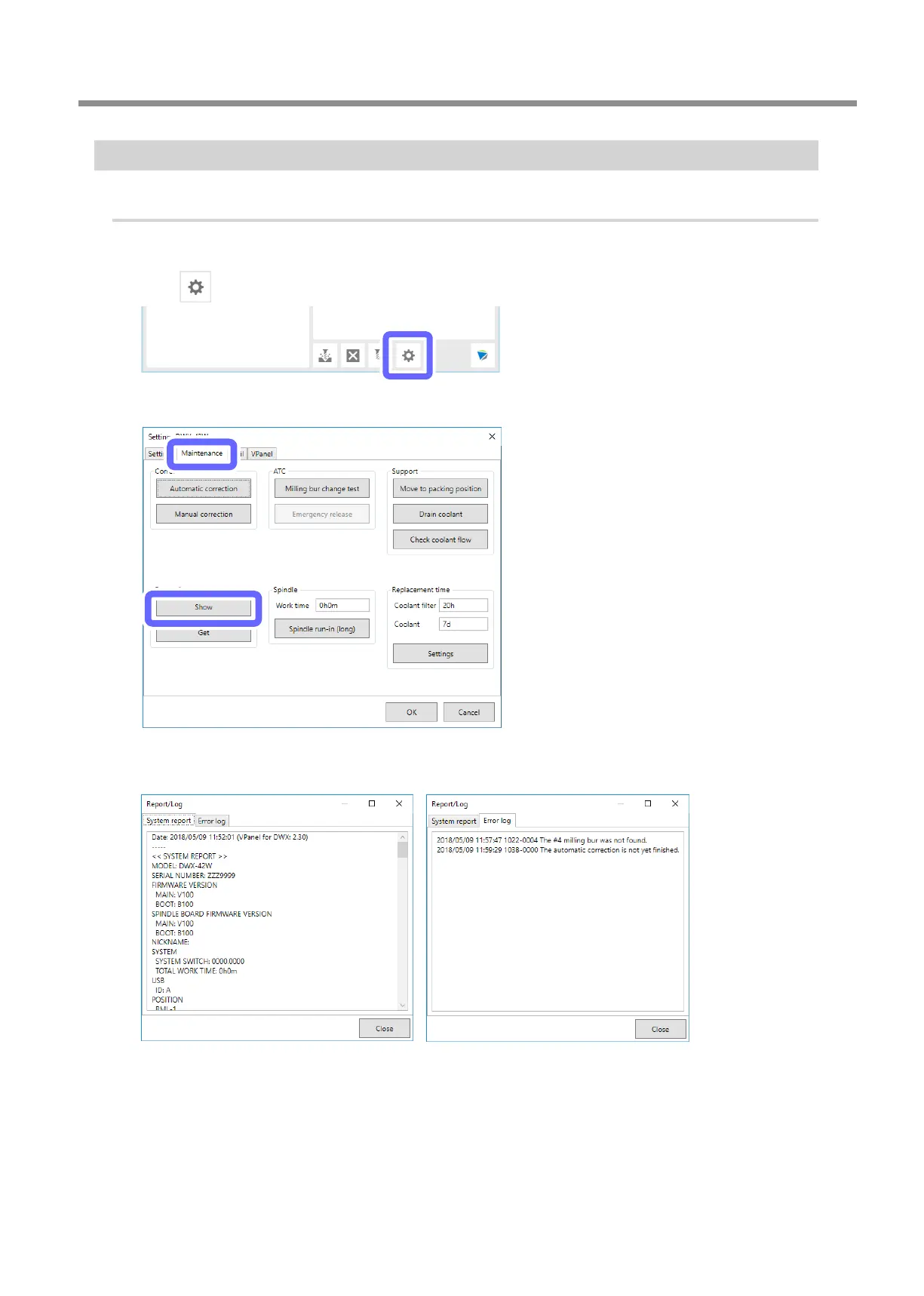 DGSHAPE DWX-42W - Displaying System Reports;Error Logs
