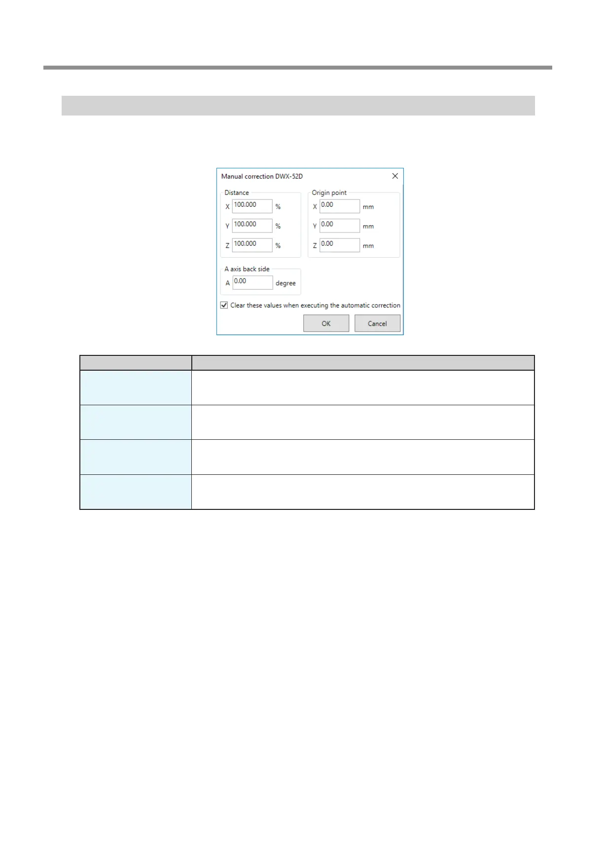 In this dialog box, you can perform manual correction of the milling machine. Perform correction to precisely adjust the accuracy.