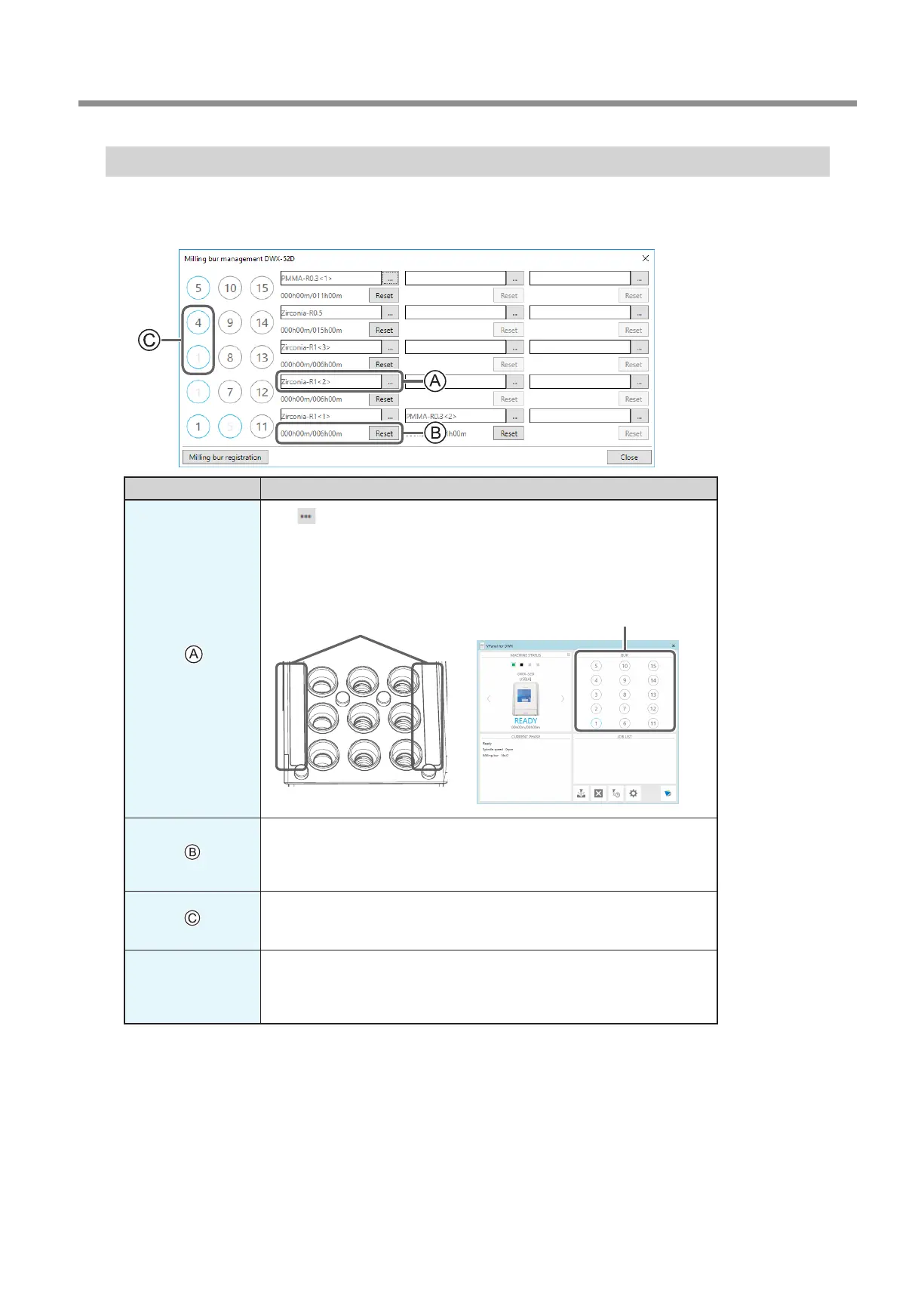 performed. Numbers 1 through 15 match the milling bur stocker numbers on the