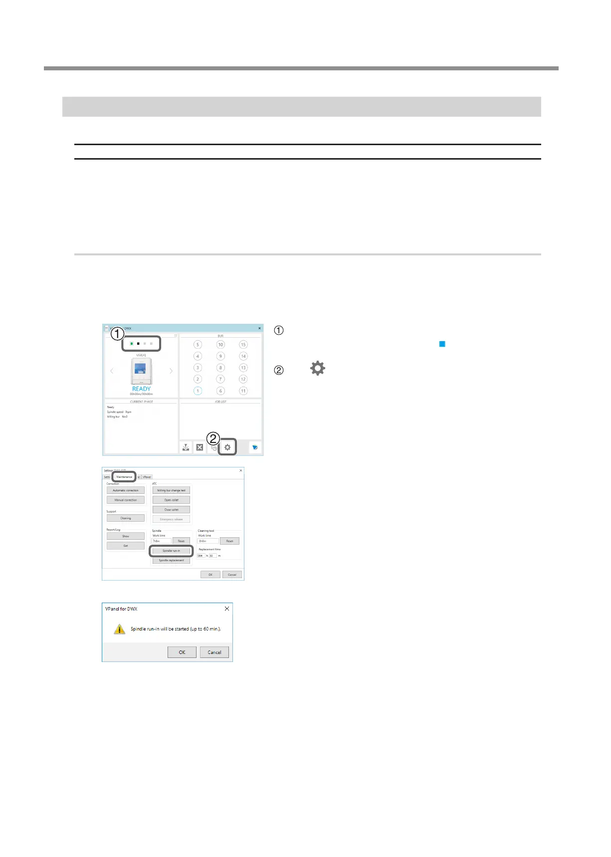 Click the "Maintenance" tab, and then click [Spindle run‑in].