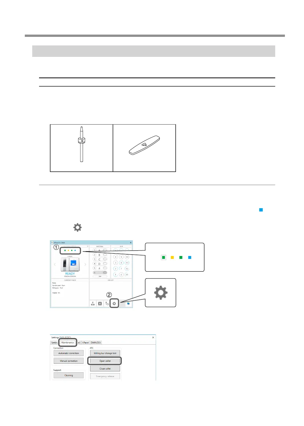 Click [Open collet] on the "Maintenance" tab.