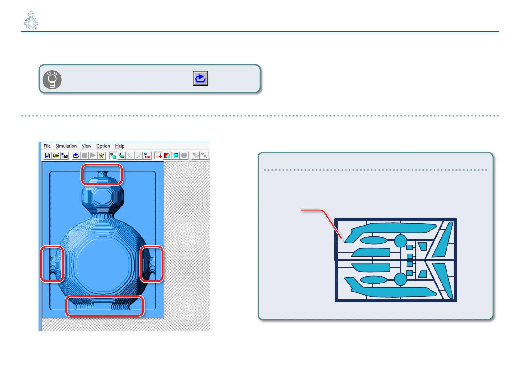 When checking data in Virtual MODELA, check that the areas in the red boxes are present.