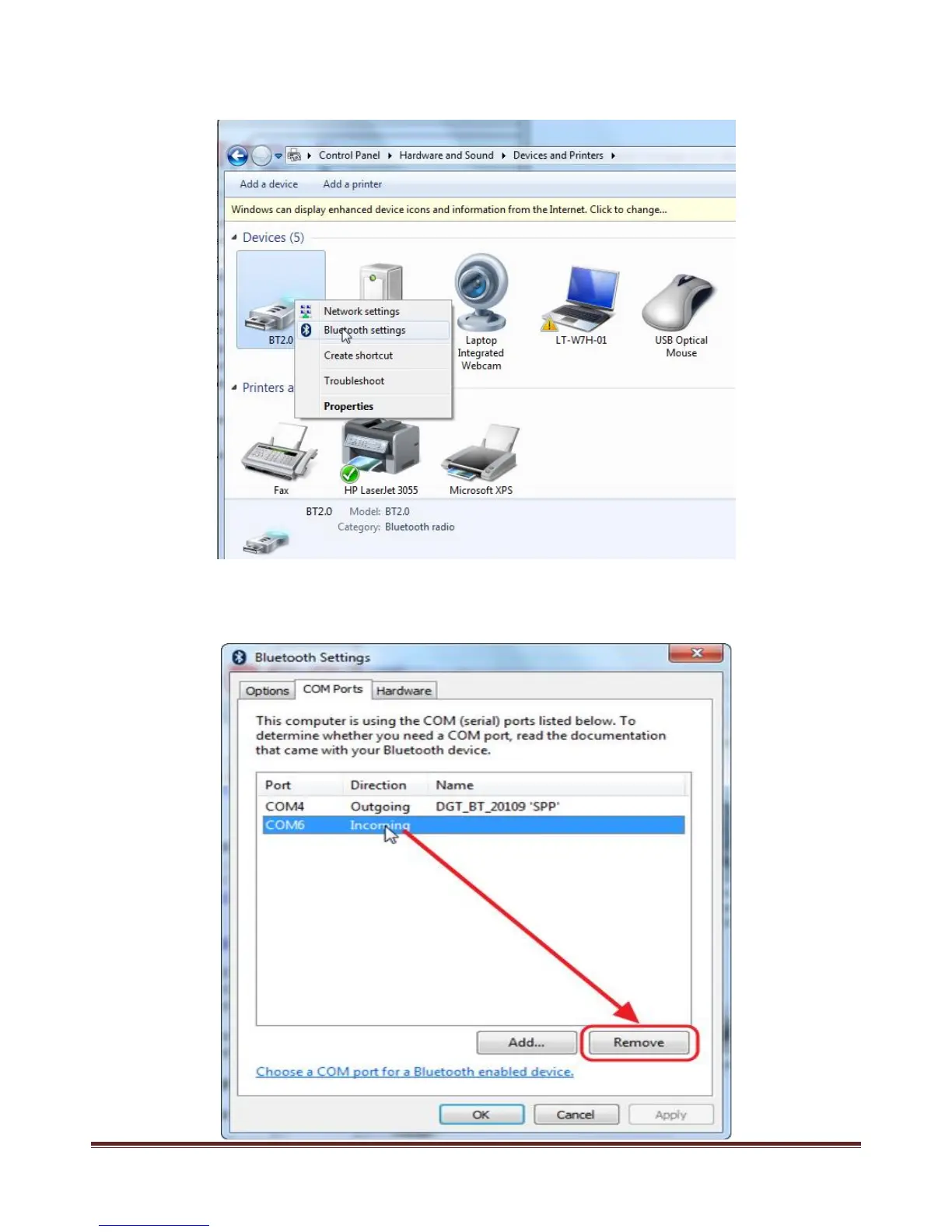may lock-up your Bluetooth connection if used. Please remove this incoming COM port number as described below.