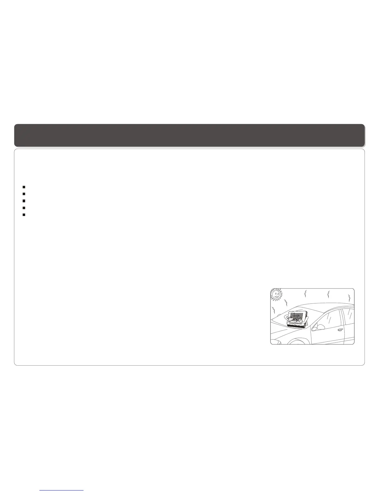 Do not place the Player in direct sunlight, dashboard of a vehicle, or high temperature place. It can cause battery explosion or fire.