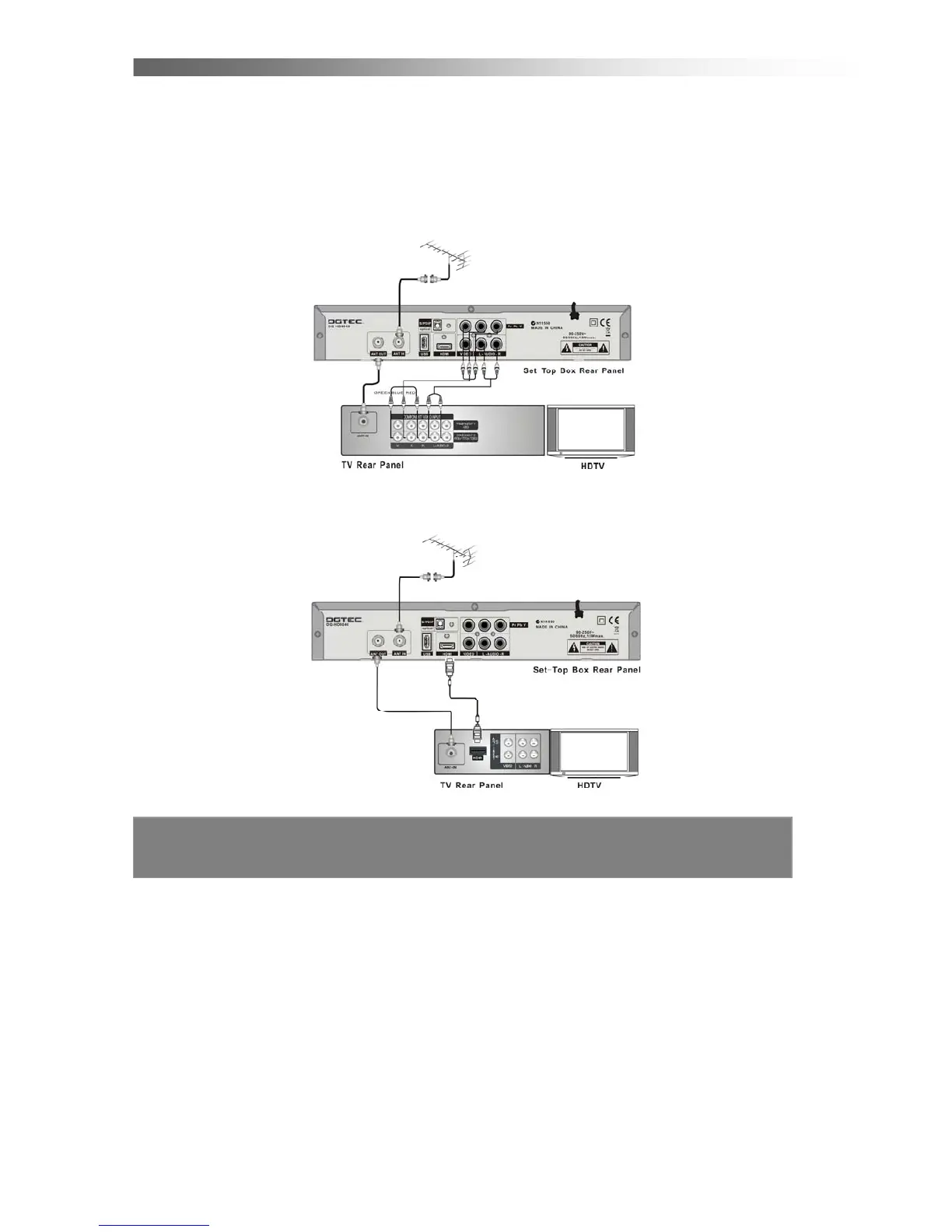 1. Connect your TV antenna cable to the “ANT IN” jack on the back of the STB using