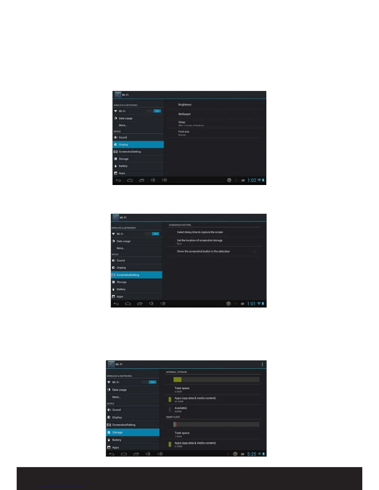 Set options for screen brightness, change wallpaper, sleep (screen time-out) and font