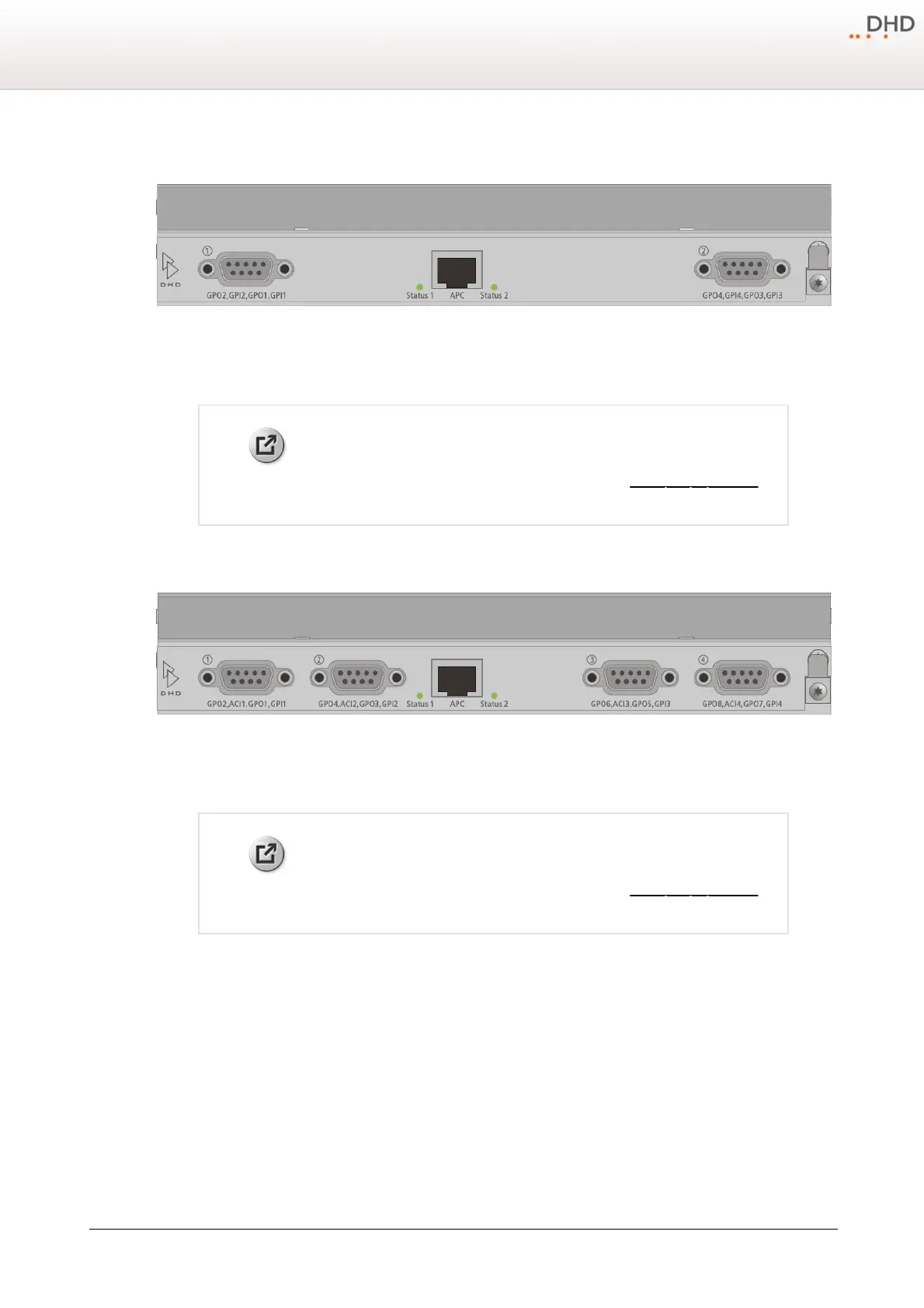 The connectors on the rear site of the 52-7222 and 52-7223 are D-sub type (9 pins) and provide all GPIOs for this