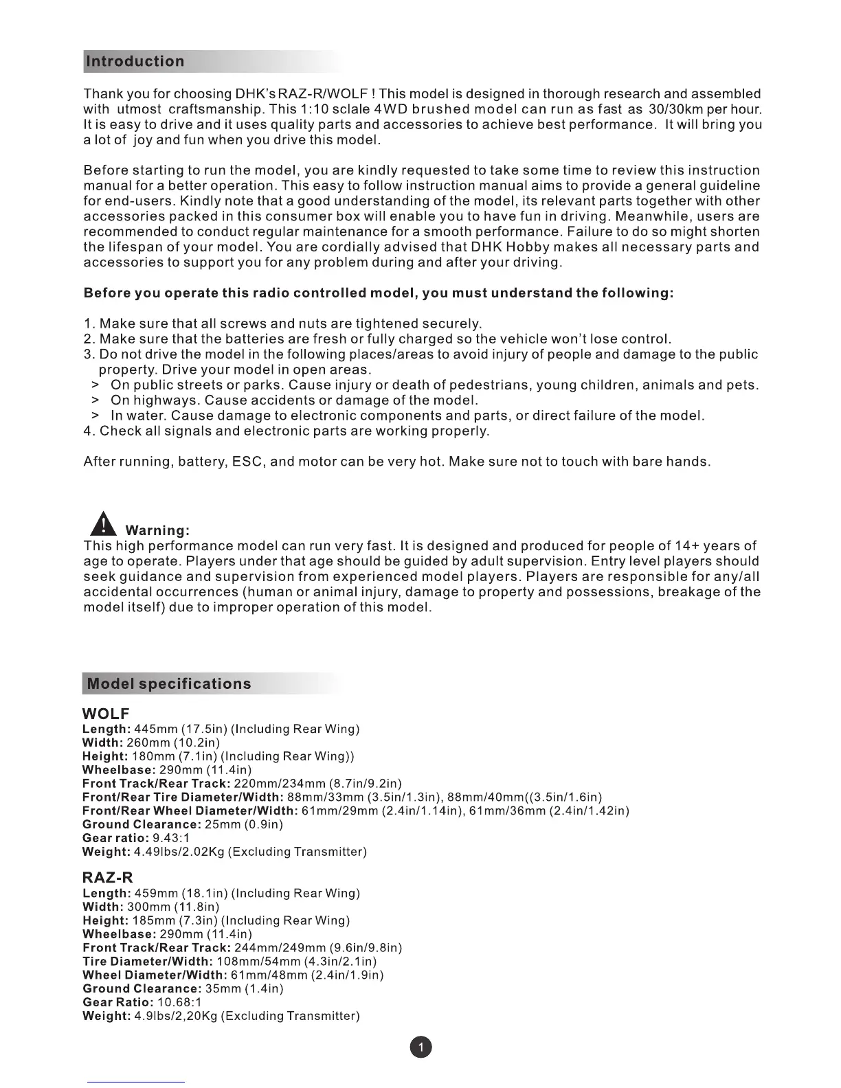 DHK Hobby Wolf - Introduction to DHK Models; Pre-Operation Understanding; Critical Safety Precautions; Model Specifications Overview