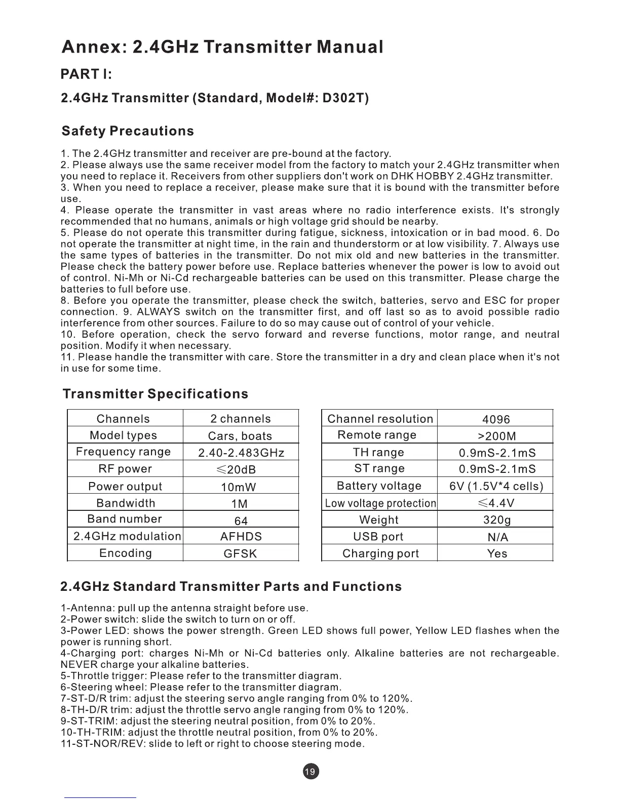 DHK Hobby Wolf - Transmitter Manual Annex; Standard Transmitter (D302 T) Operation; Transmitter Safety Precautions; Transmitter Specifications Overview