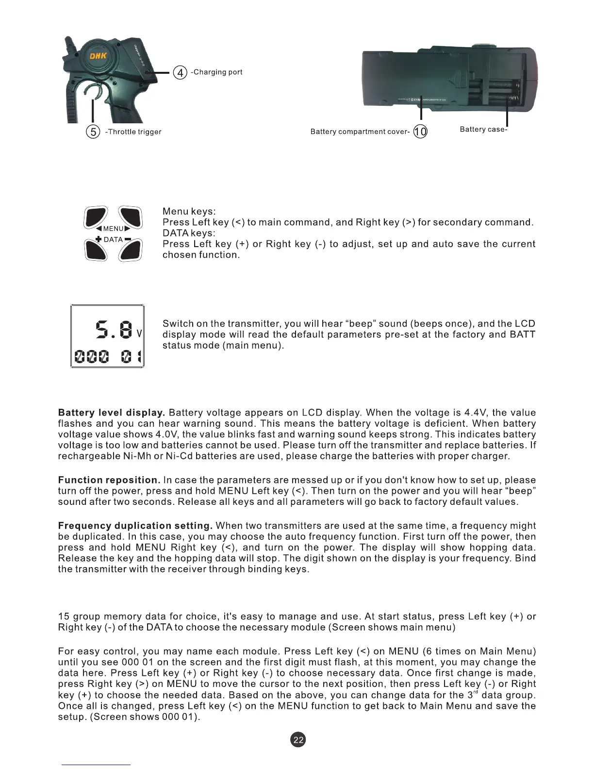 BATT: battery status, function reset settings