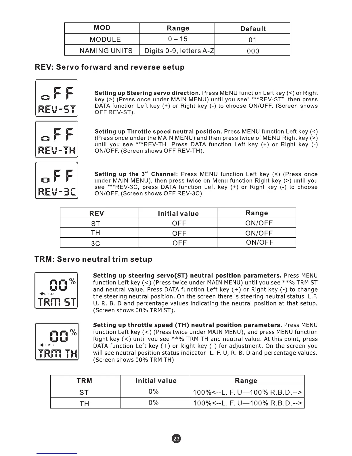 DHK Hobby Wolf - Servo Neutral Trim Setup (TRM); Steering Neutral Trim Adjustment; Throttle Neutral Trim Adjustment; Servo Angle Adjustment (D;R)