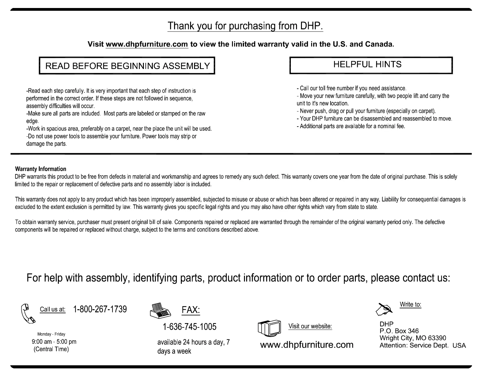 DHP 3155096W - Assembly Guidance and Warranty; Pre-Assembly Instructions; Helpful Assembly Hints; Product Warranty Information