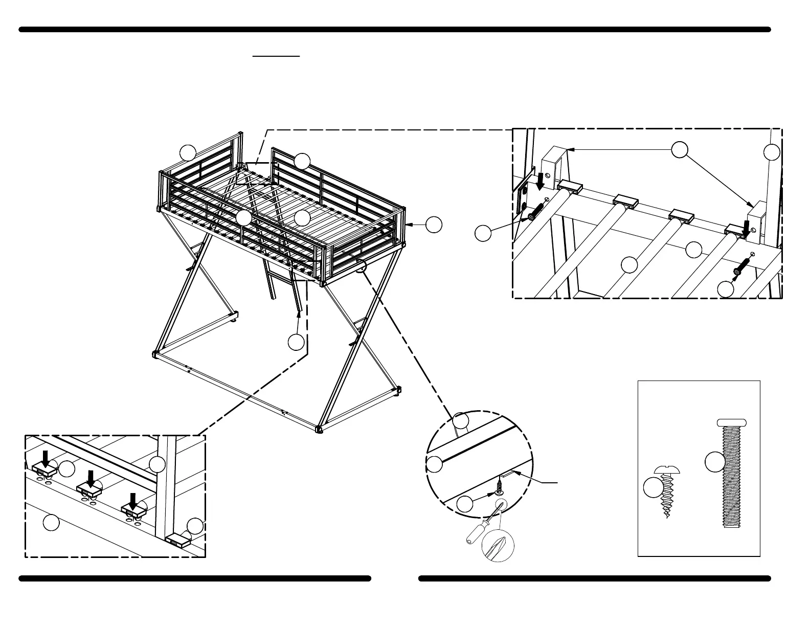 As shown in detail (1), insert, by hand, the slats (M) into the Upper Side Rails (H & G). Attach the ends of the belt (M) to the
