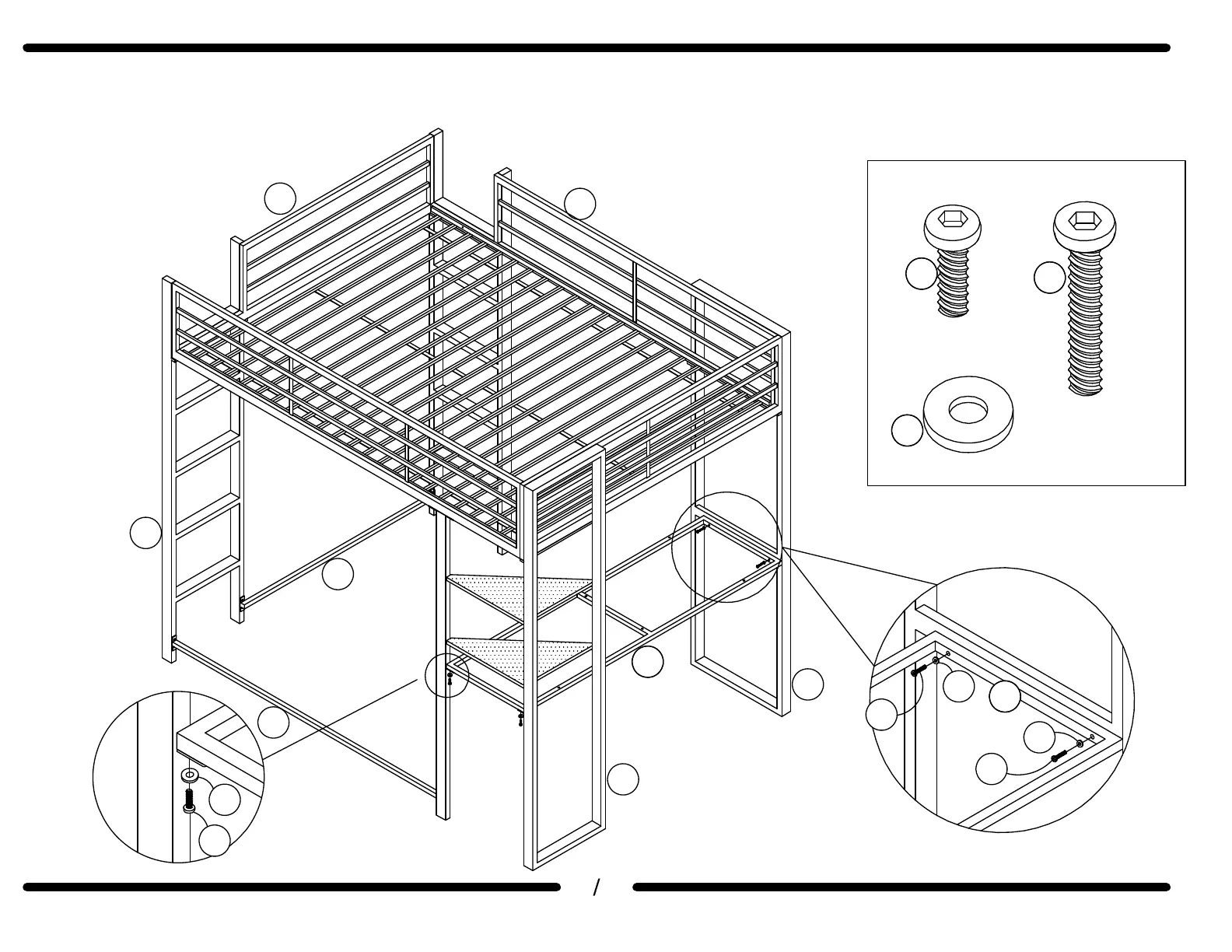 Attach the DESK FRAME (O) to the FRONT LEFT LEG (A), BACK LEFT LEG (B), and SINGLE LEG (E) using the BOLTS (1 & 3)