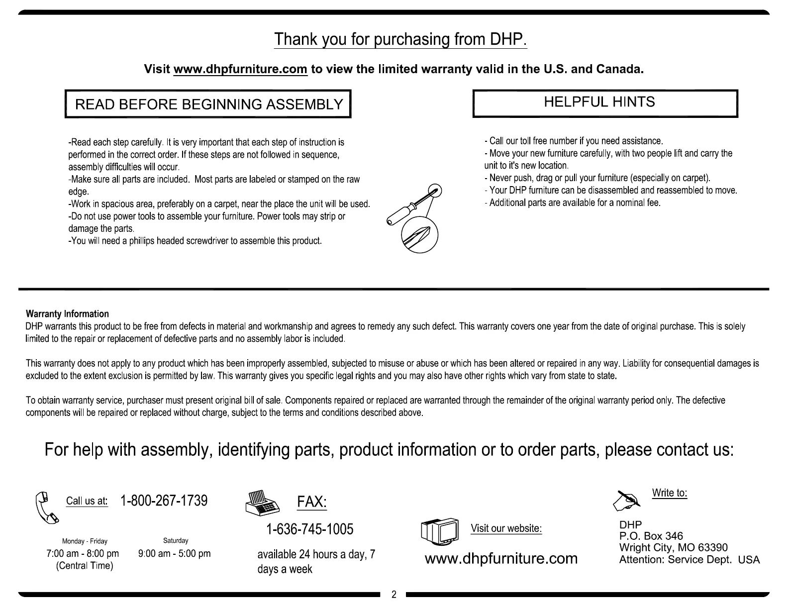 DHP 5457096 - Assembly Preparation and Support; Pre-Assembly Guidelines; Helpful Assembly Tips; Warranty and Service Information
