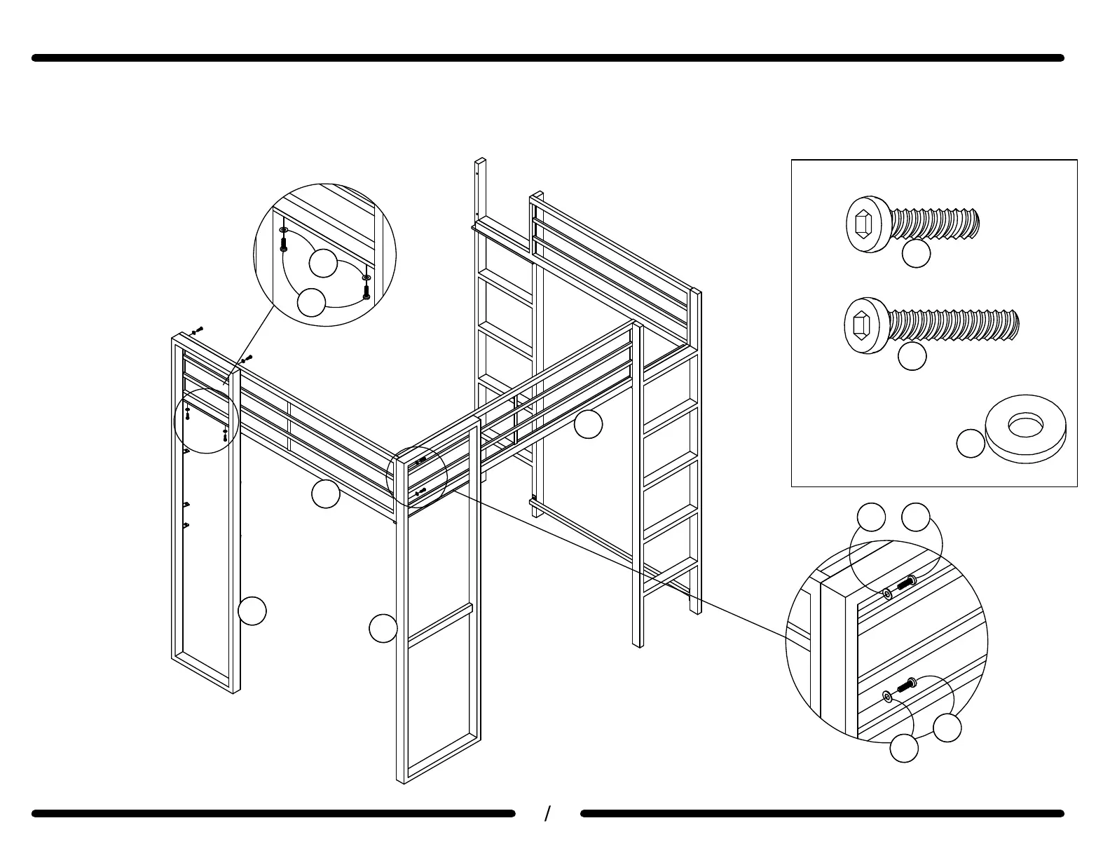 Attach the LEFT GUARD RAIL (L) to the FRONT LEFT LEG (A) and the BACK LEFT LEG (B) with the BOLTS (2 & 3) and