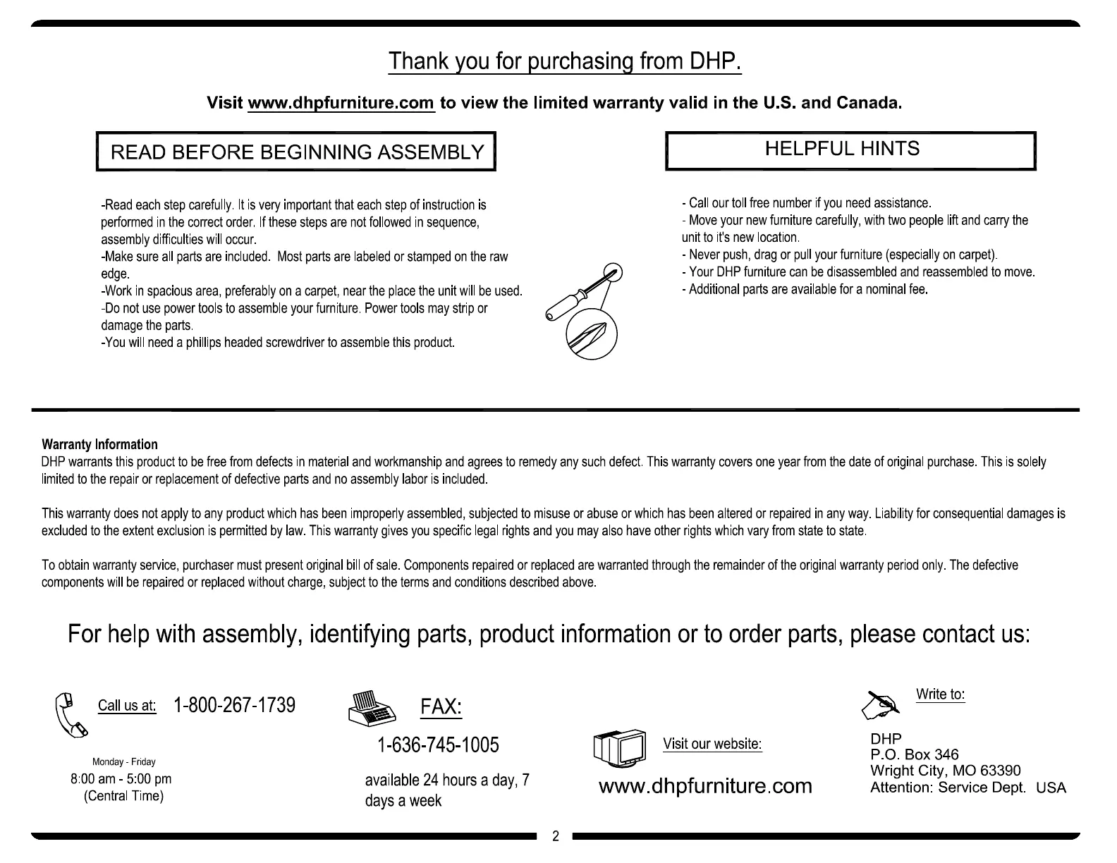 DHP 5458196 - Pre-Assembly Guidance; Read Before Beginning Assembly; Helpful Hints