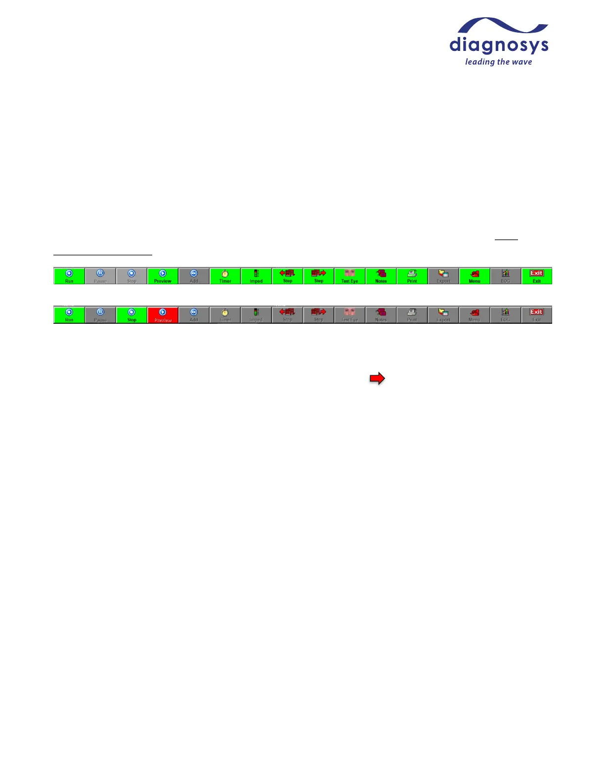 The Run button will start the test. Most Diagnosys-provided protocols are automatically sequenced, which