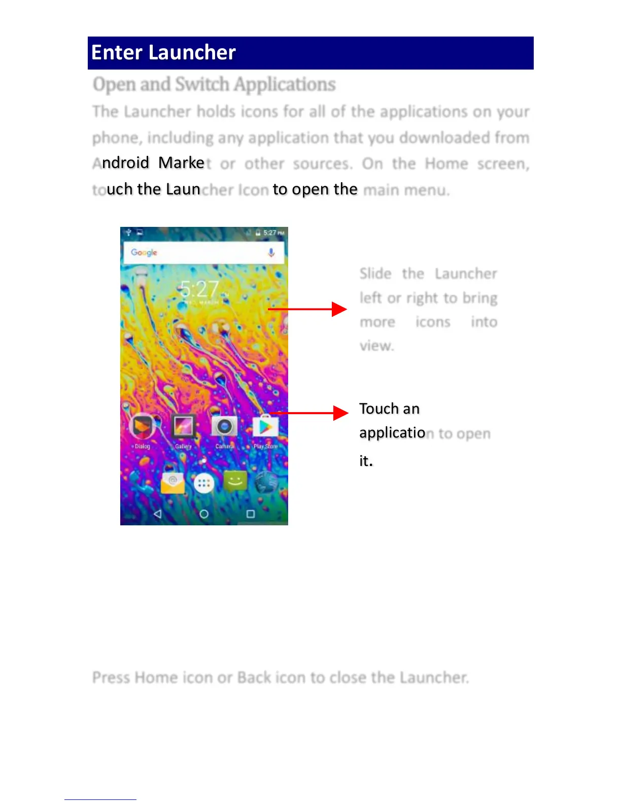 Press Home icon or Back icon to close the Launcher.