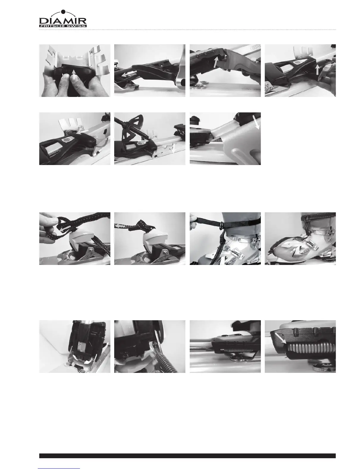 Pictures 4.4 A–D show how to fix the safety leash on the toe piece (1) and on the leg.