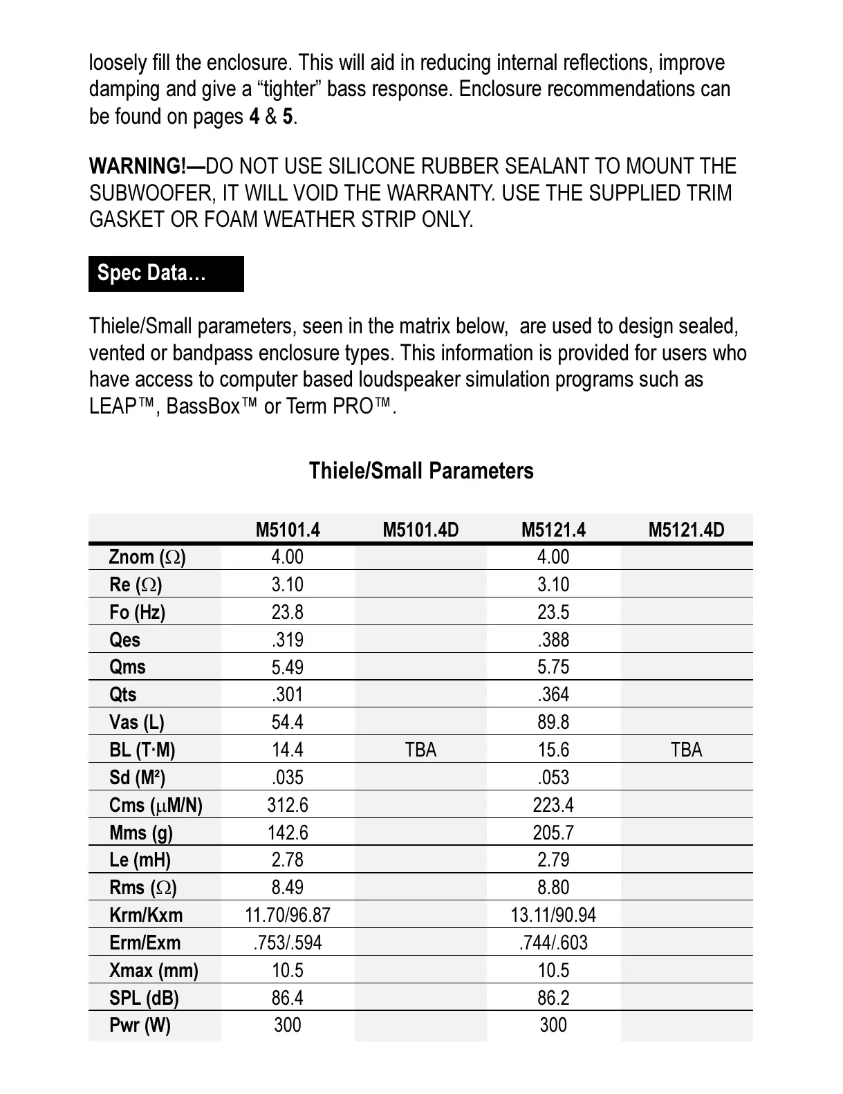 damping and give a tighter bass response. Enclosure recommendations can