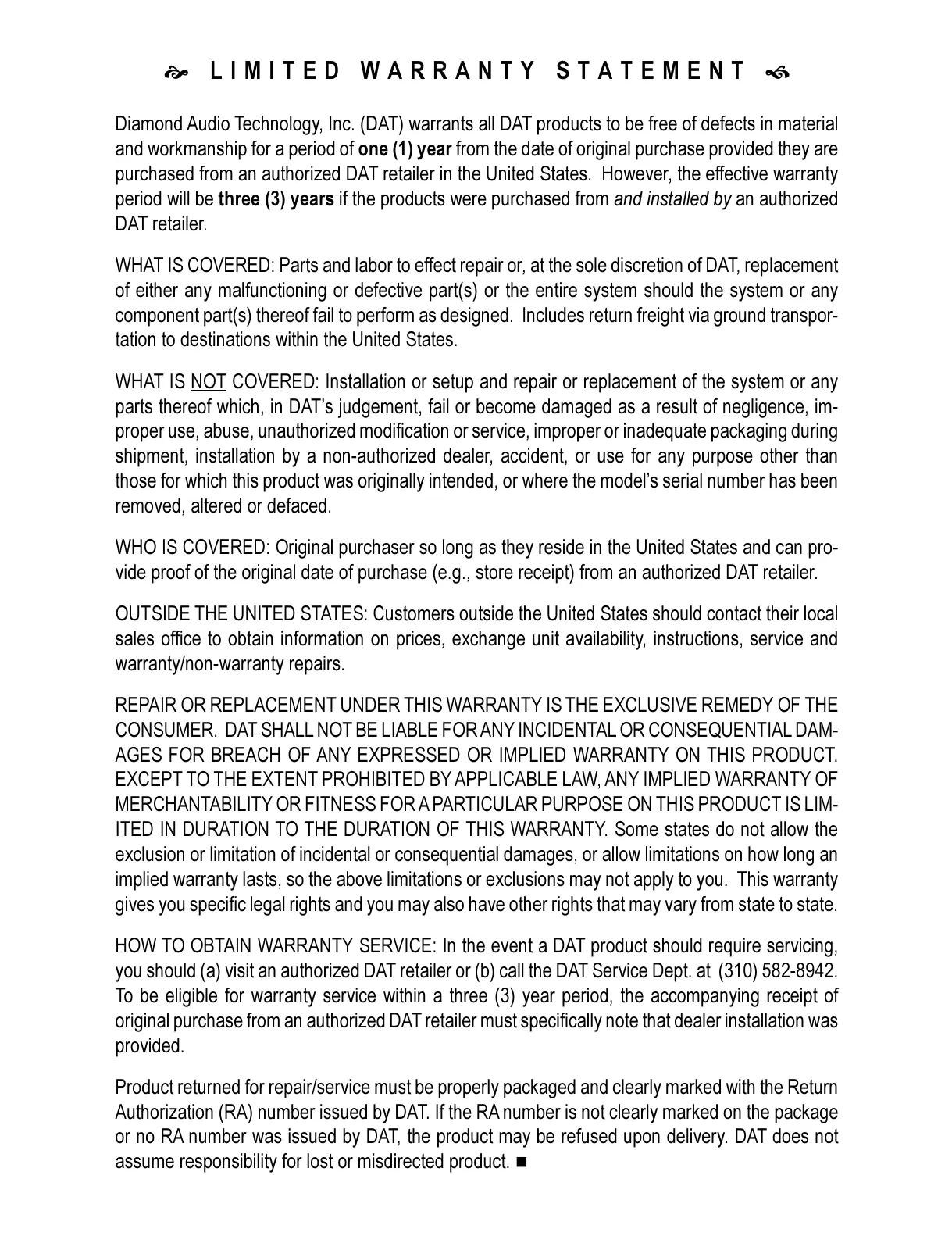HOW TO OBTAIN WARRANTY SERVICE: In the event a DAT product should require servicing,