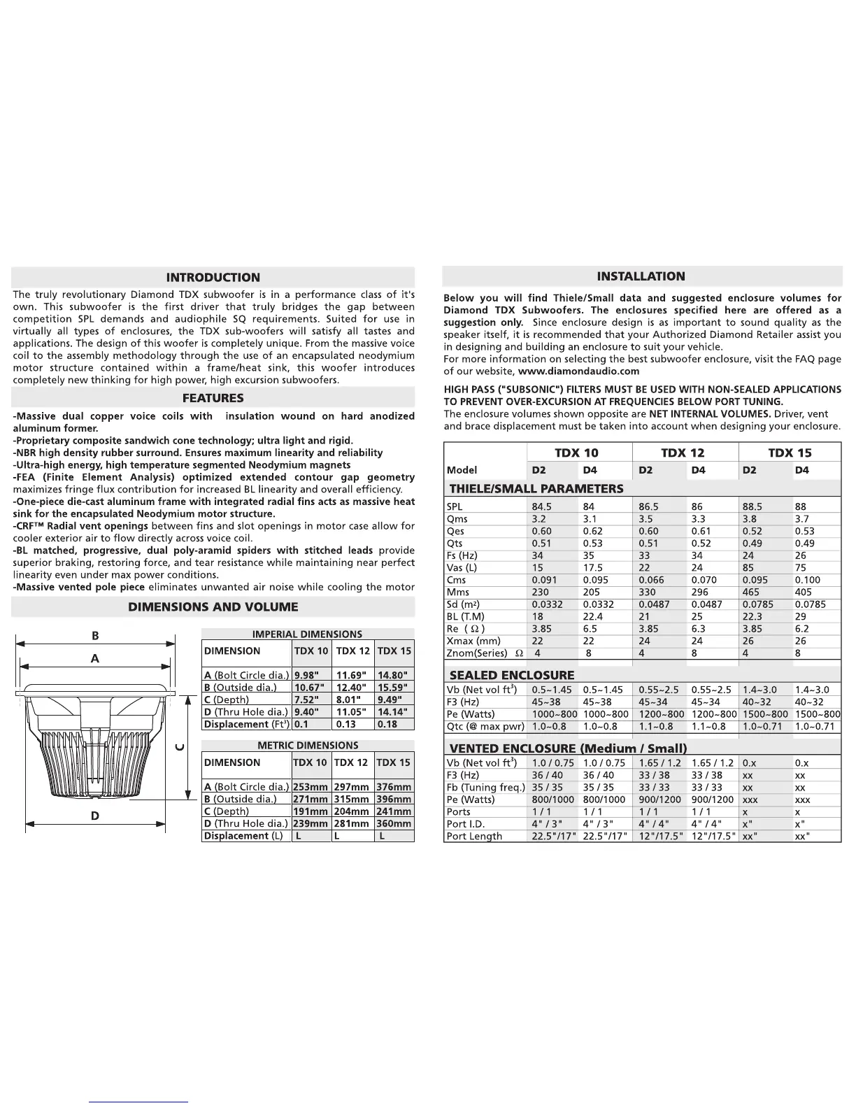 Diamond Audio Technology TDX 10D2 - INTRODUCTION; FEATURES; DIMENSIONS AND VOLUME; INSTALLATION