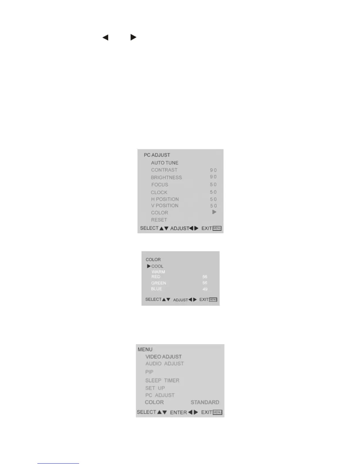 2. Contrast, Brightness, Focus, Clock, H Position, V Position and