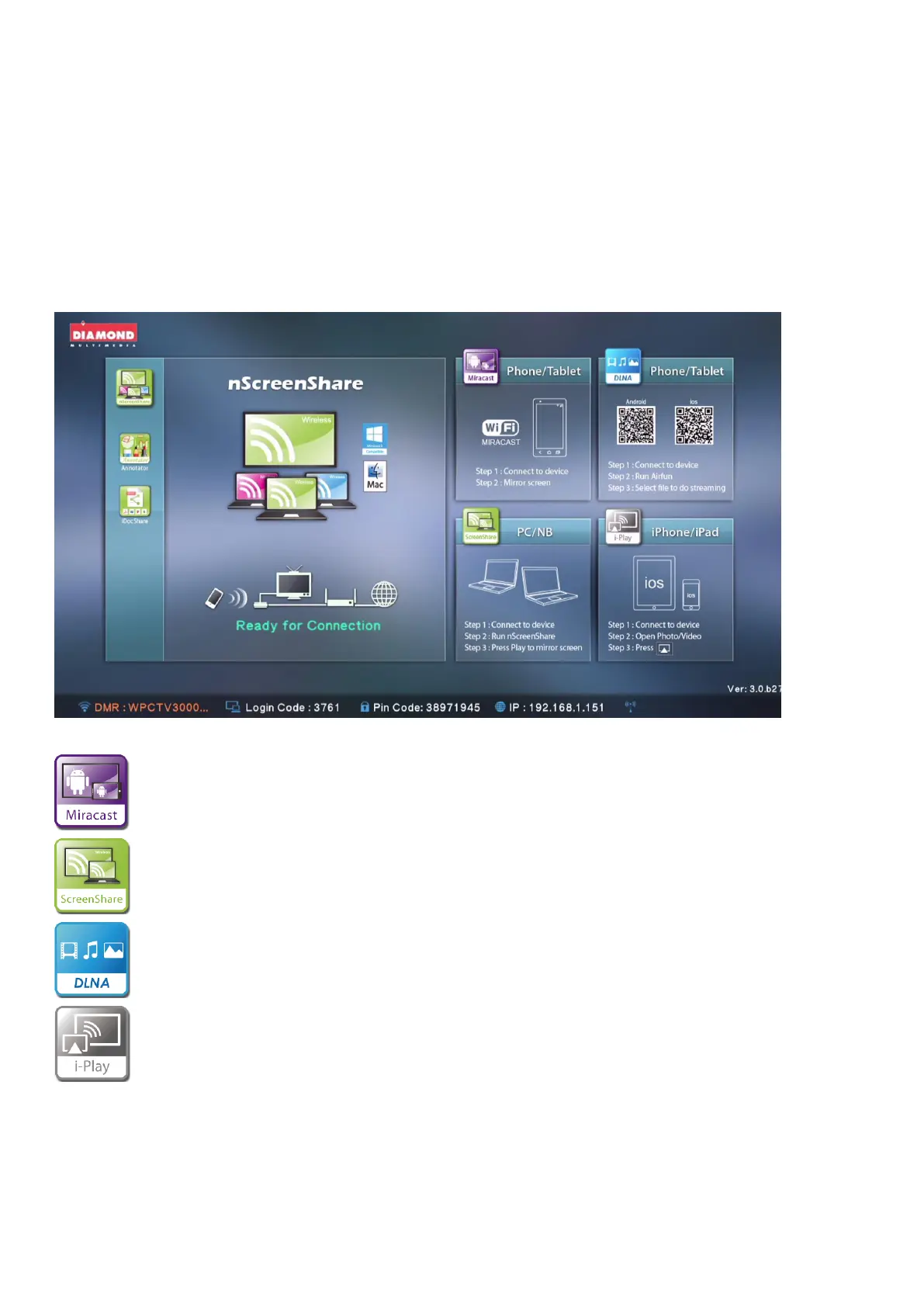 Miracast: Screen mirroring from smart phone, or tablet through (Wi-Fi Miracast technology)
