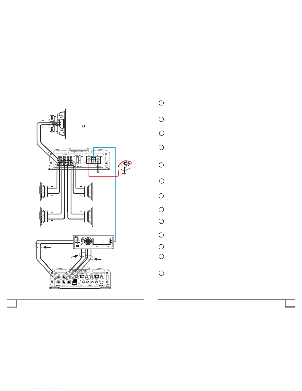 connections use the LEFT + and RIGHT - as the two connections. The 2 and 4 channel amplifiers will perform into 2 Ohm stereo loads or 4 Ohm