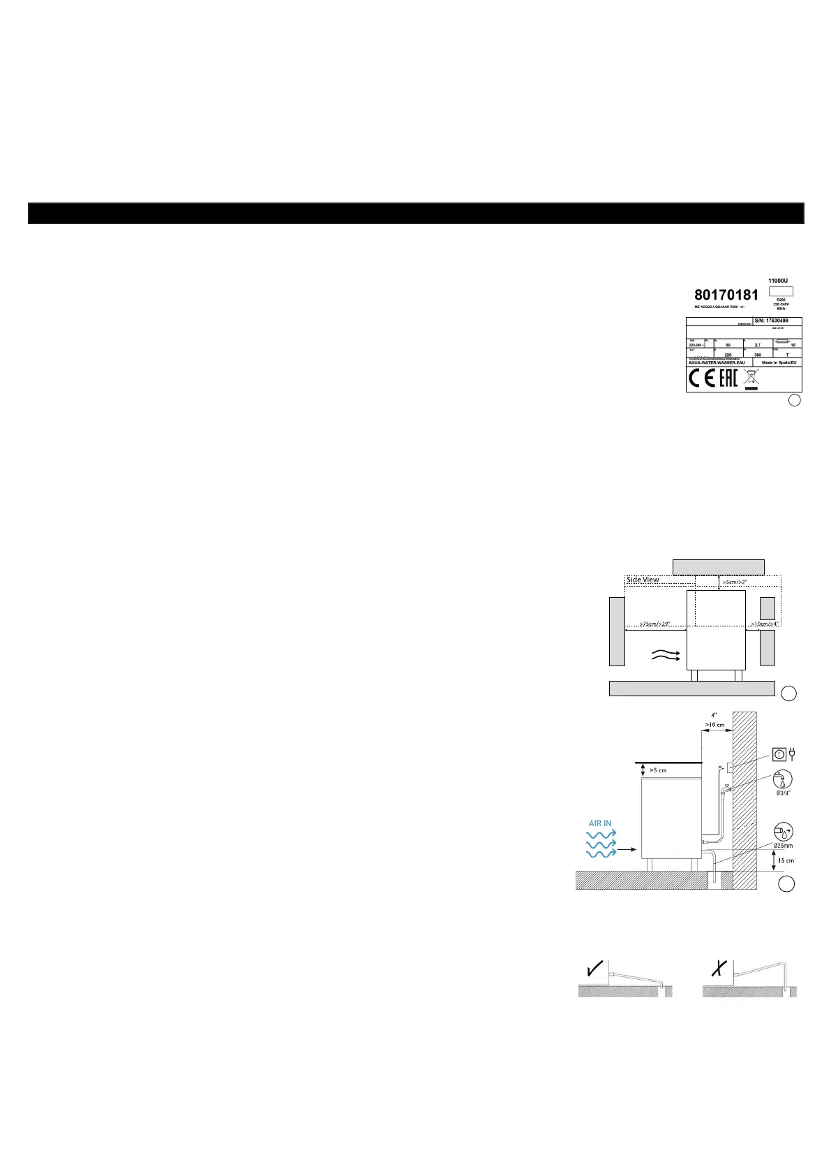 Odpływ musi znajdować się niżej niż maszyna, co najmniej 150 mm.