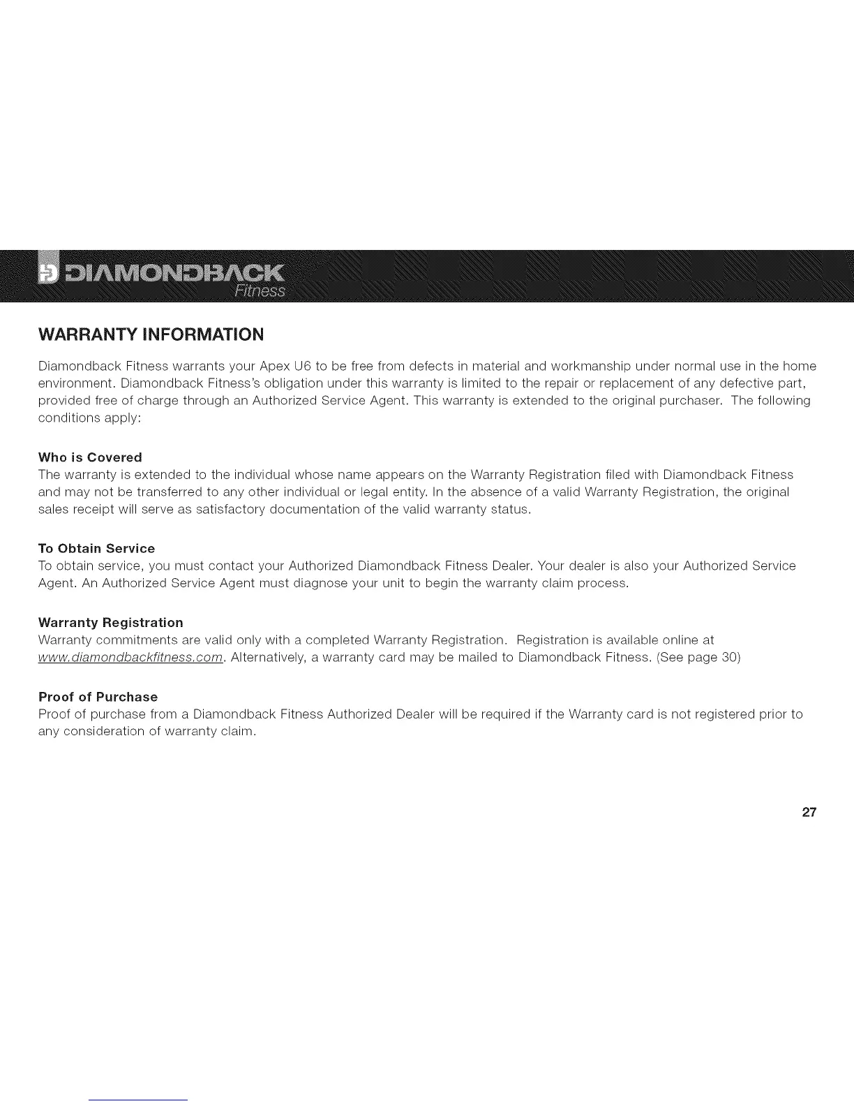 Diamondback Fitness warrants your Apex U6 to be free from defects in material and workmanship under normal use in the home