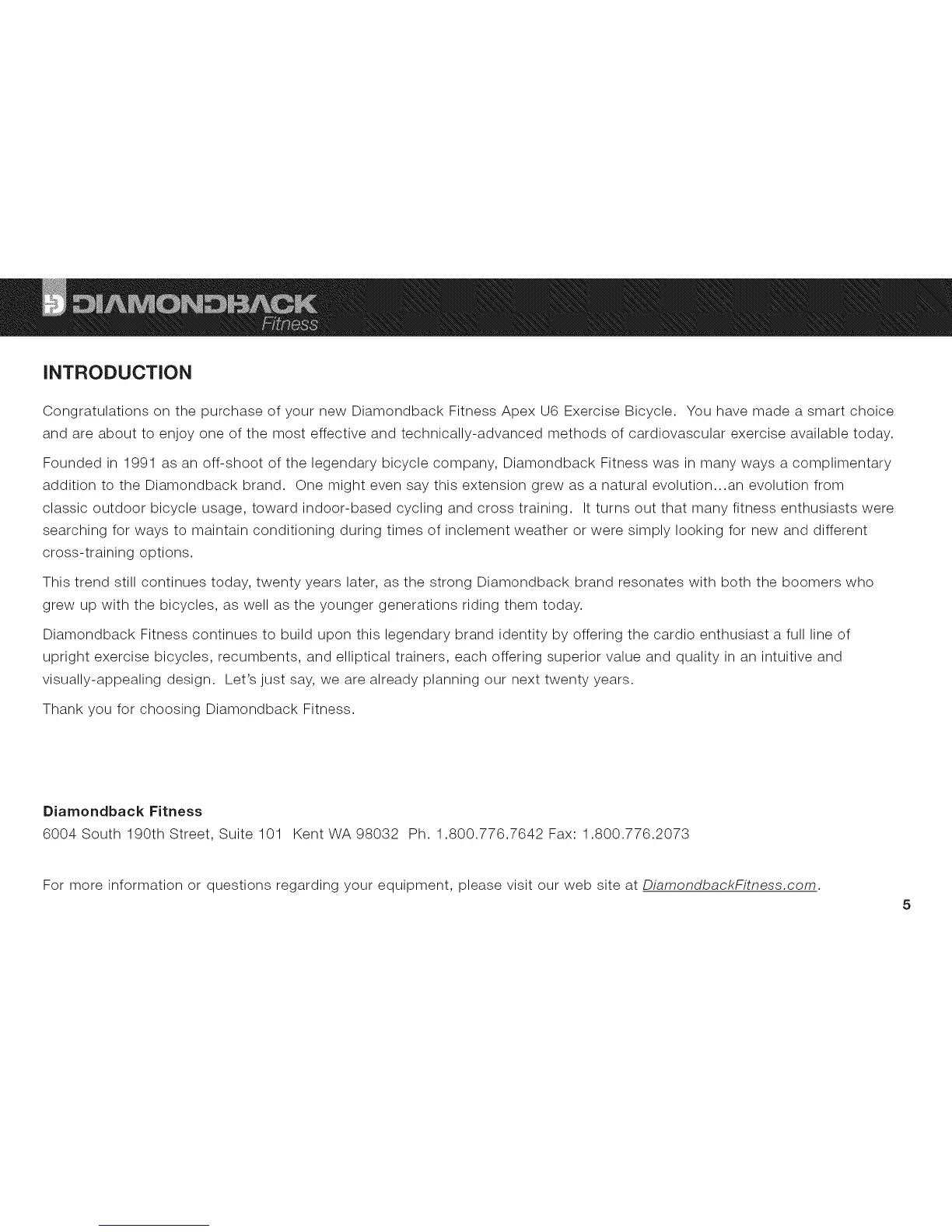 Congratulations on the purchase of your new Diamondback Fitness Apex U6 Exercise Bicycle. You have made a smart choice