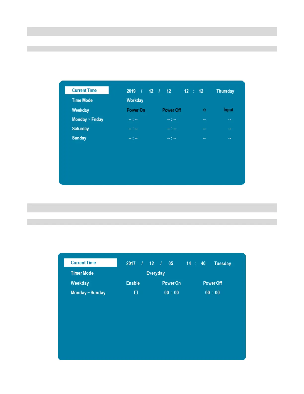 Select the power on/off time for Monday-Friday, Saturday and Sunday