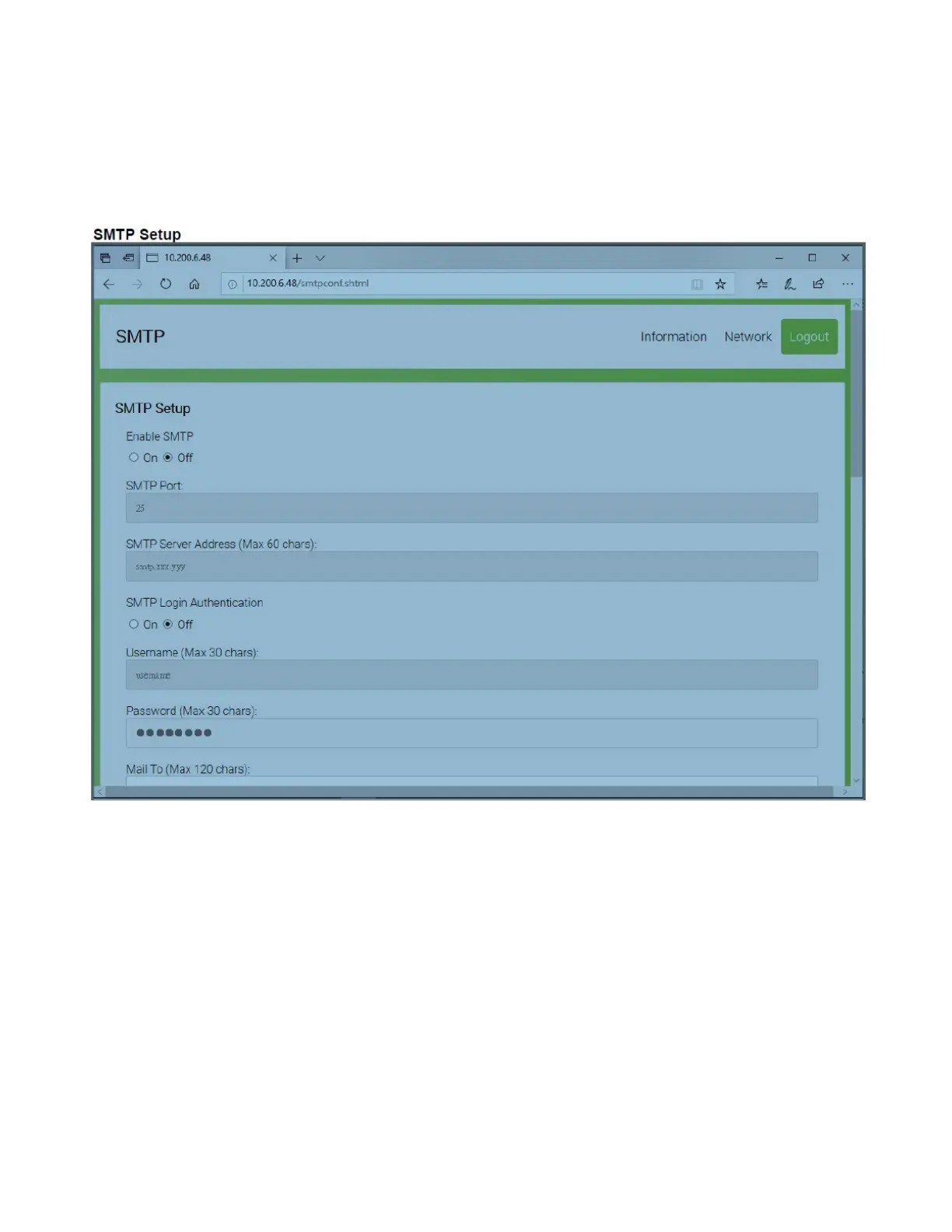a. SMTP Setup allows you to configure the SMTP Server address, SMTP Login Information, Mail to and from