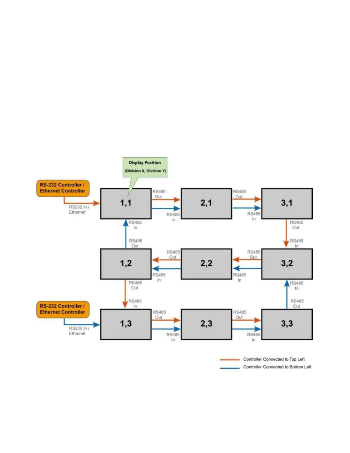 It is not recommended that more than 25 display panels be daisy-chained together using the RS485 input and