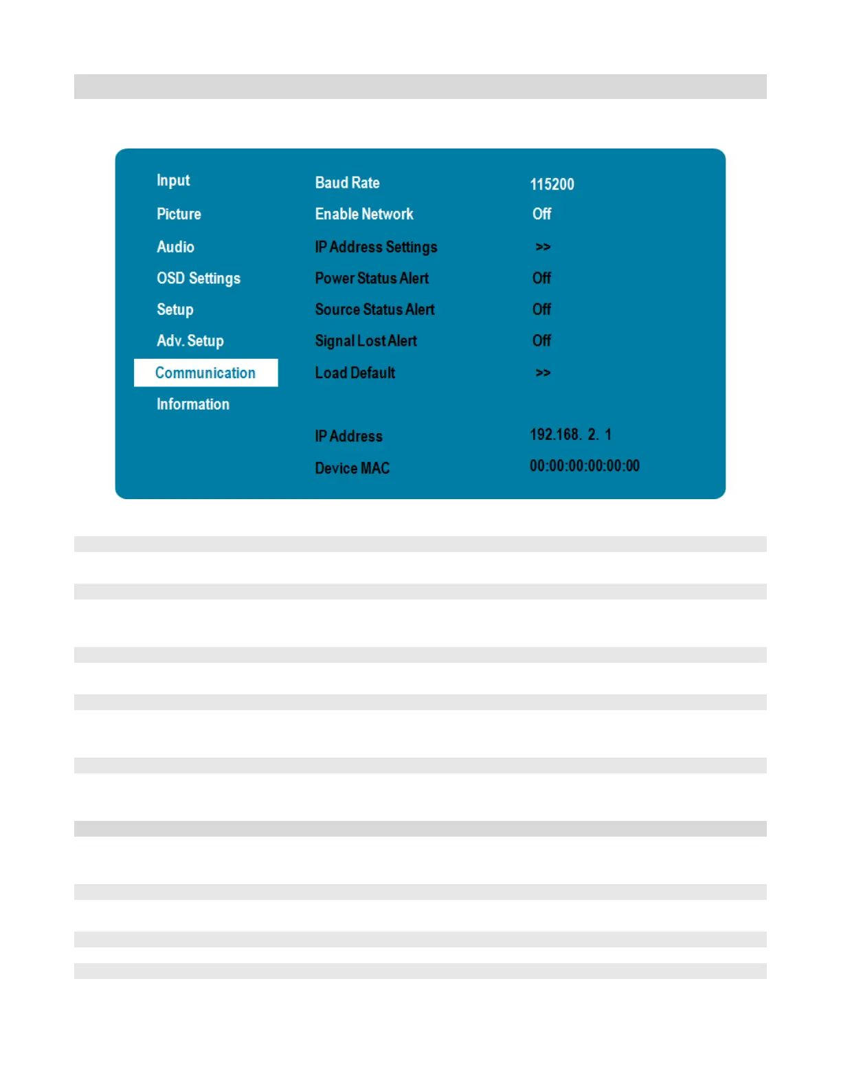 This menu configures the display’s RS-232 and Ethernet communication ports.