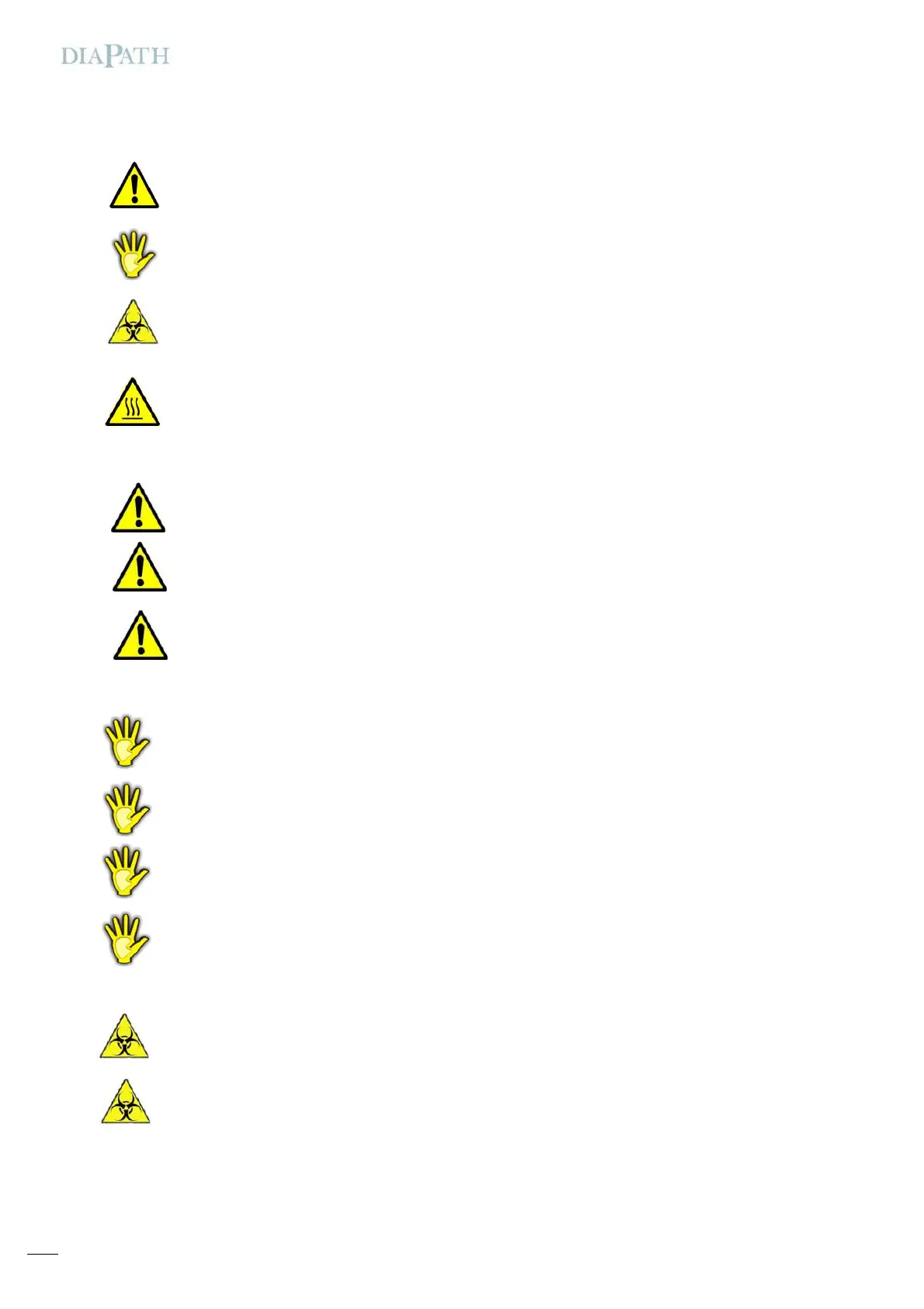 Never disassemble, modify or repair the instrument or one of its parts without written authorization by Diapath S.p.A.